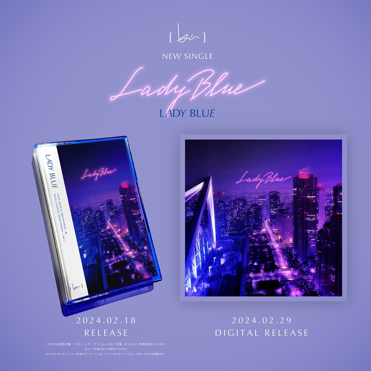 今作もこれまで同様、作詞、作曲、編曲はもちろん、ミックス、マスタリングまで本人がトータルプロデュースを行なっている。さらにこちらの「LADY BLUE」はライブ開催日、会場において、CDではなく“カセットテープ”で販売することが決定した。ネオン風のタイトル文字、大都会の夜景など、リバイバルブームに沸いた「シティ・ポップ」をオマージュしたようなアートーワーク、カセットのラベルに至るまで、[ kei ]というアーティスト、その新譜をこれまでとはまったく違う角度、新たな解釈で楽しめるきわめて斬新なアイテムとなっている。