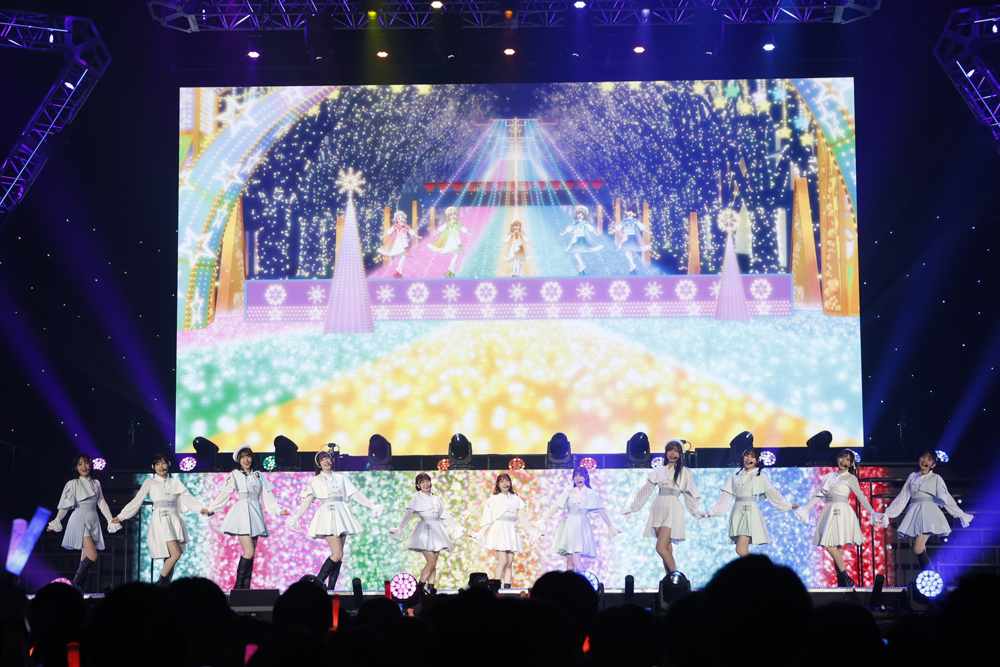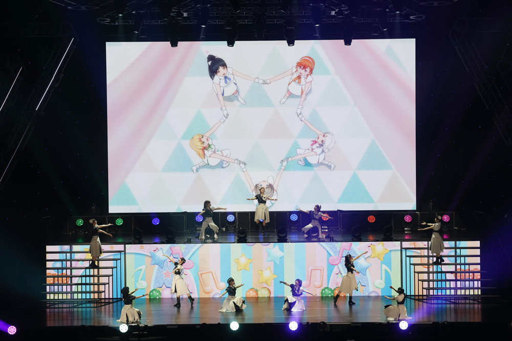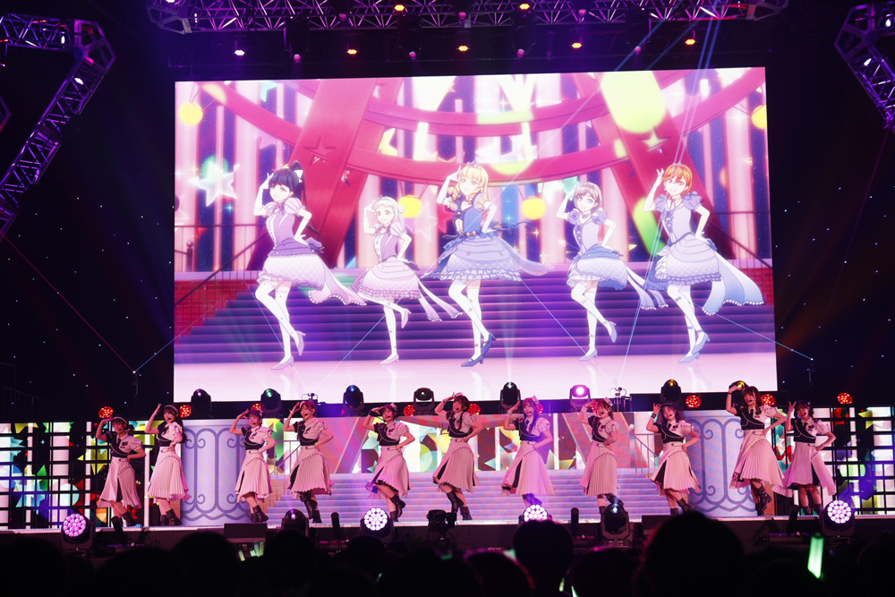 そんな11人の中から、ペイトンをアップで捉えた映像がスクリーンに映し出される。そして彼女のキメ顔からの「ギャラクシー!」の叫びから、TVアニメ1期第10話のライブシーンと共に「ノンフィクション!!」がスタート。シンクロパフォーマンスを交えてながらの11人バージョンとしてのステージや、ペイトンのいたずらっぽい顔にすみれのメンバーカラーのメロングリーンに輝いた場内も沸き上がりった。