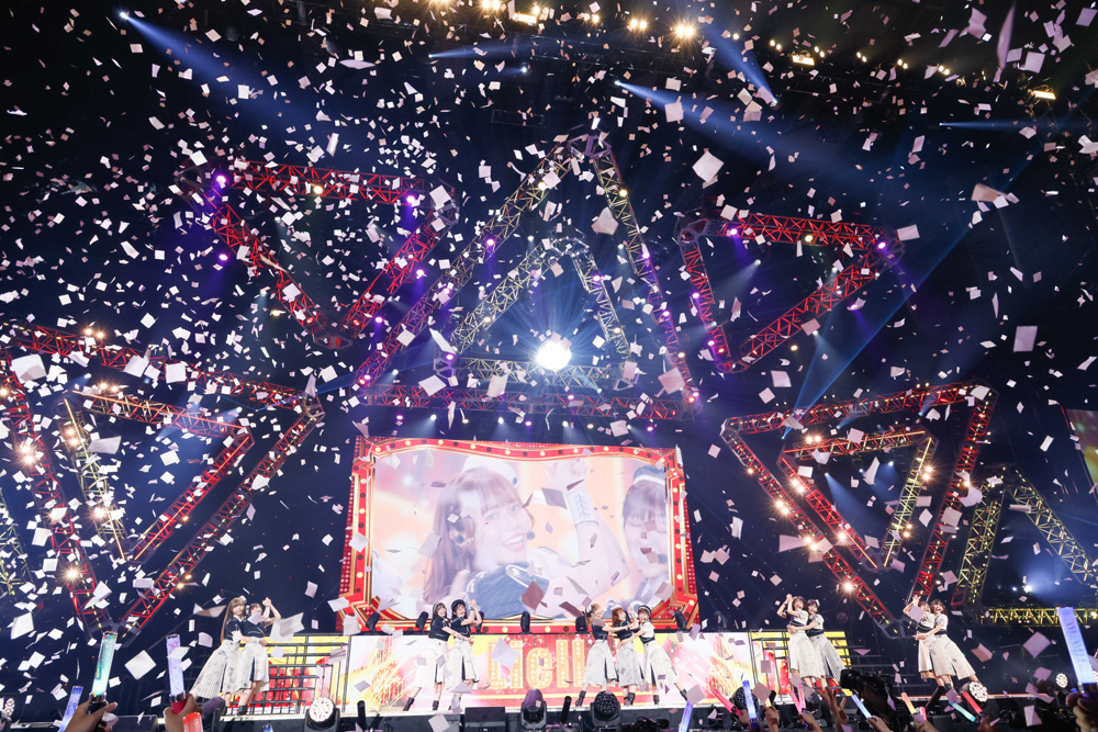 そしてラストを締めくくるのは、5thライブのテーマソング「シェキラ☆☆☆」。リズミカルなクラップと「もっとLiella!の世界に飛び込んでおいで!」というメッセージと共に始まったステージは、ミラーボールの煌めきや派手なライティングが場内を飛び交い、その中でLiella!がオールディーズなメロディに乗せてダンスを披露し、さながら場内全体がダンスホールになったような盛り上がりに。そして投げキッス三連発のパフォーマンスや場内に吹き上がる紙吹雪に声援が沸き上がる中で、ライブは華やかに締めくくられた。