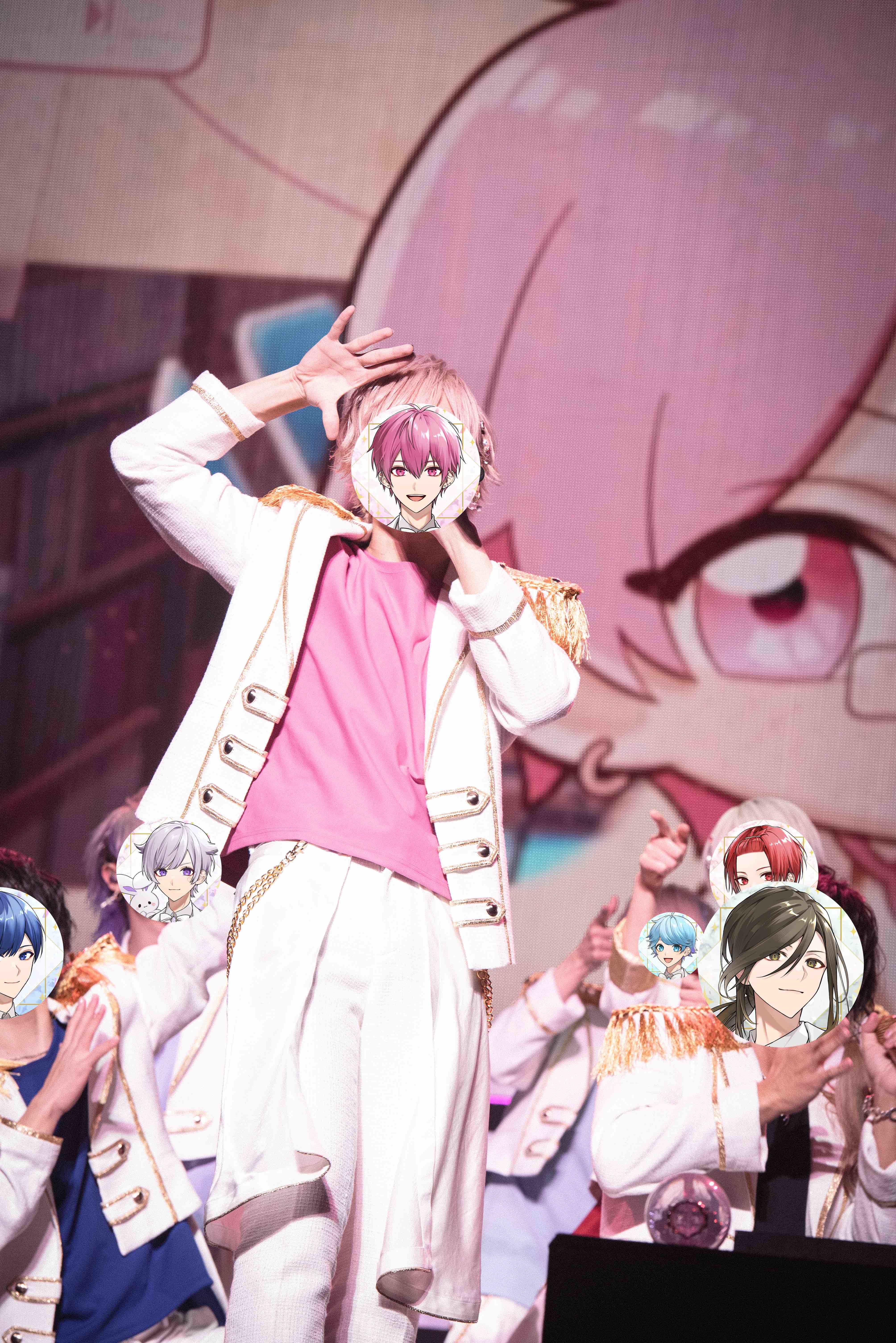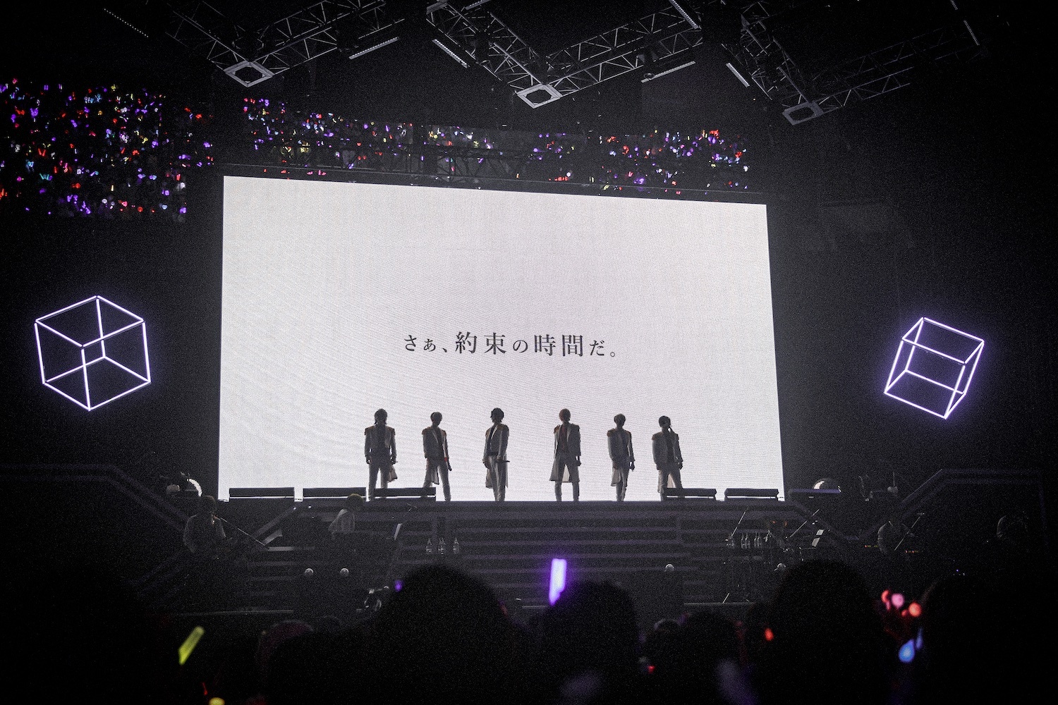 赤・水色・紫・ピンク・青・黄色と6色のダイス型ライトが目を引くステージ。活動軌跡をさかのぼって辿るオープニングムービーがあけ、その上段にりうら、-hotoke-、初兎、ないこ、If、悠佑が横並びで下からリフターで登場した1曲目は、結成日である2020年10月9日にリリースされた初のオリジナル曲「恋の約束」だ。肩に金のエポーレットのついた白衣装に身を包んで美声を重ねるその姿は、プリンス感がありすぎる。<ねえ君が好き><好きだよ>と客席を指さしたり笑顔で手を振ったりする6人に、ペンライトを大きく振って声援を送るオーディエンス。涙がこみ上げる-hotoke-をないこが抱き寄せたりして、どうしたって胸が熱くなる。