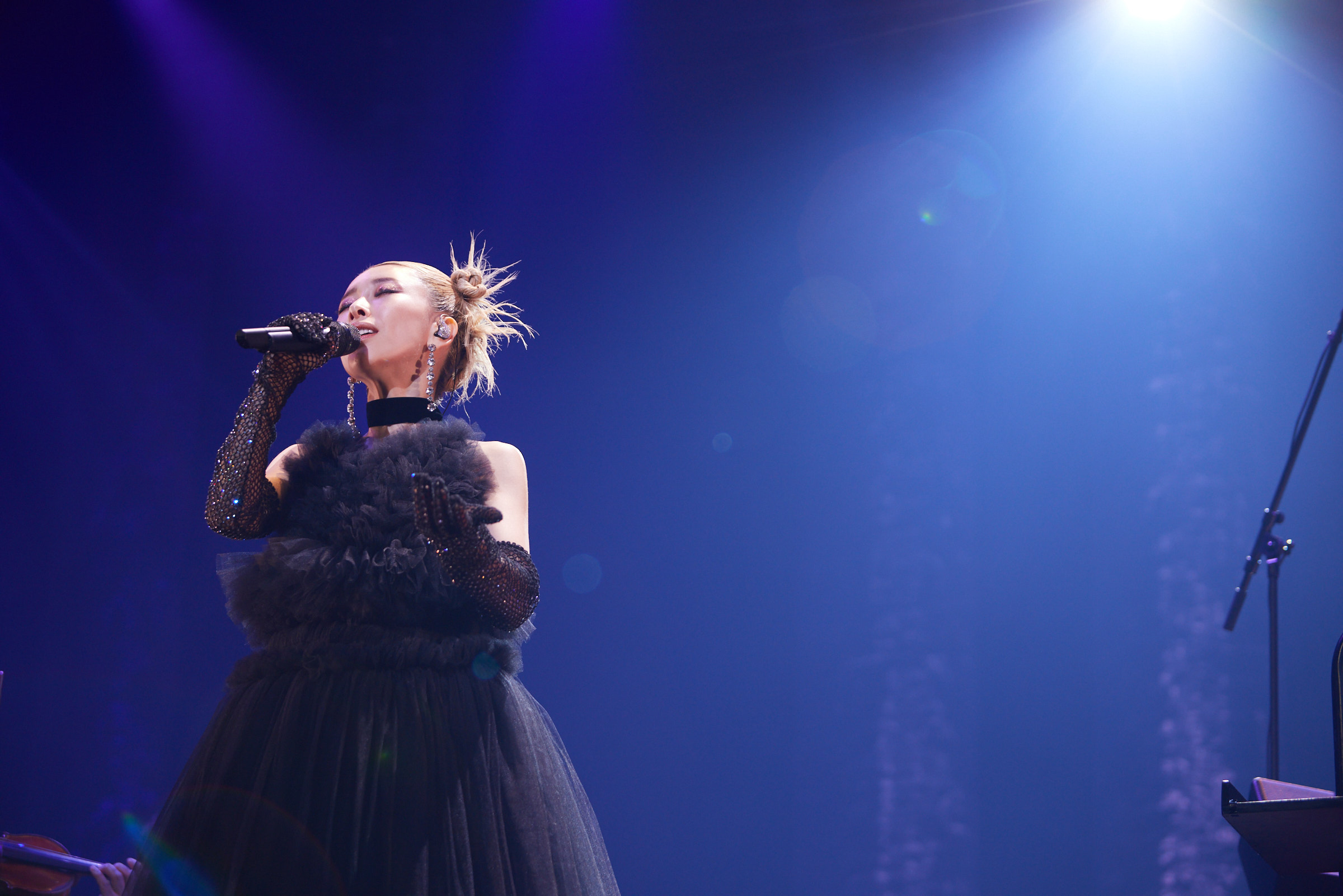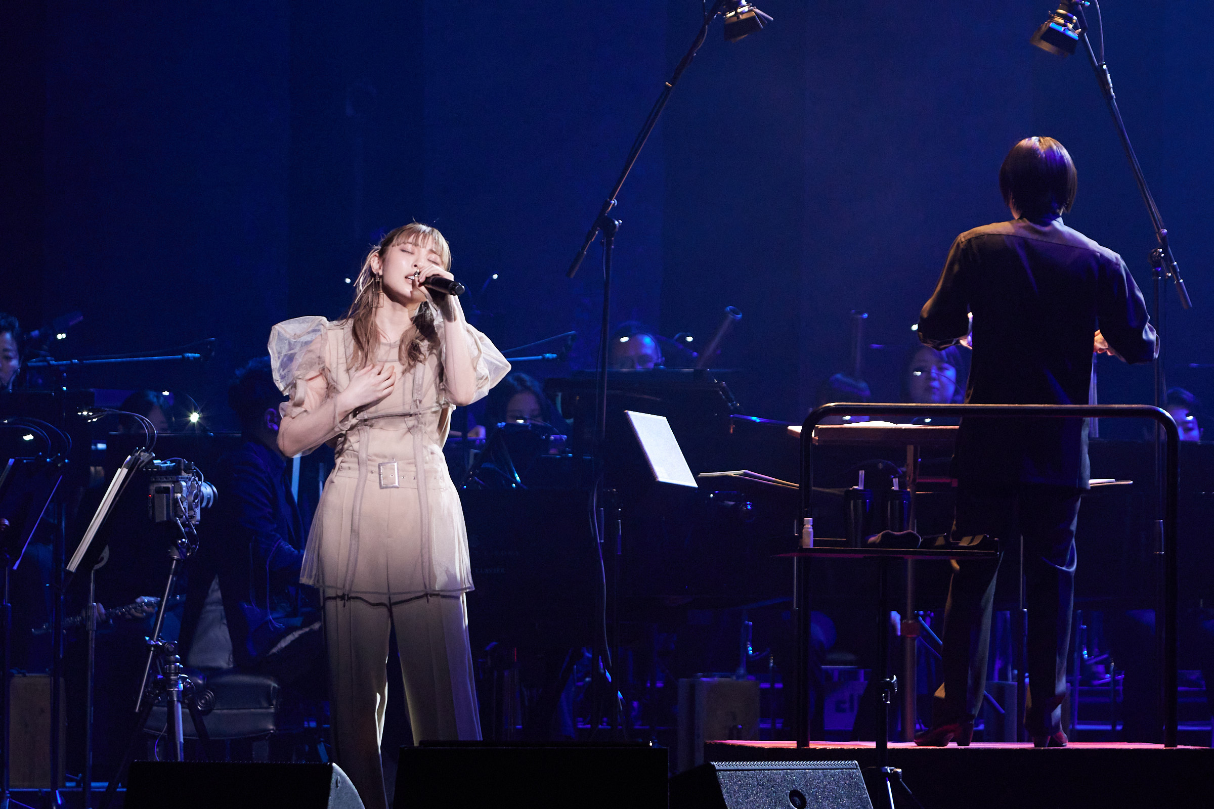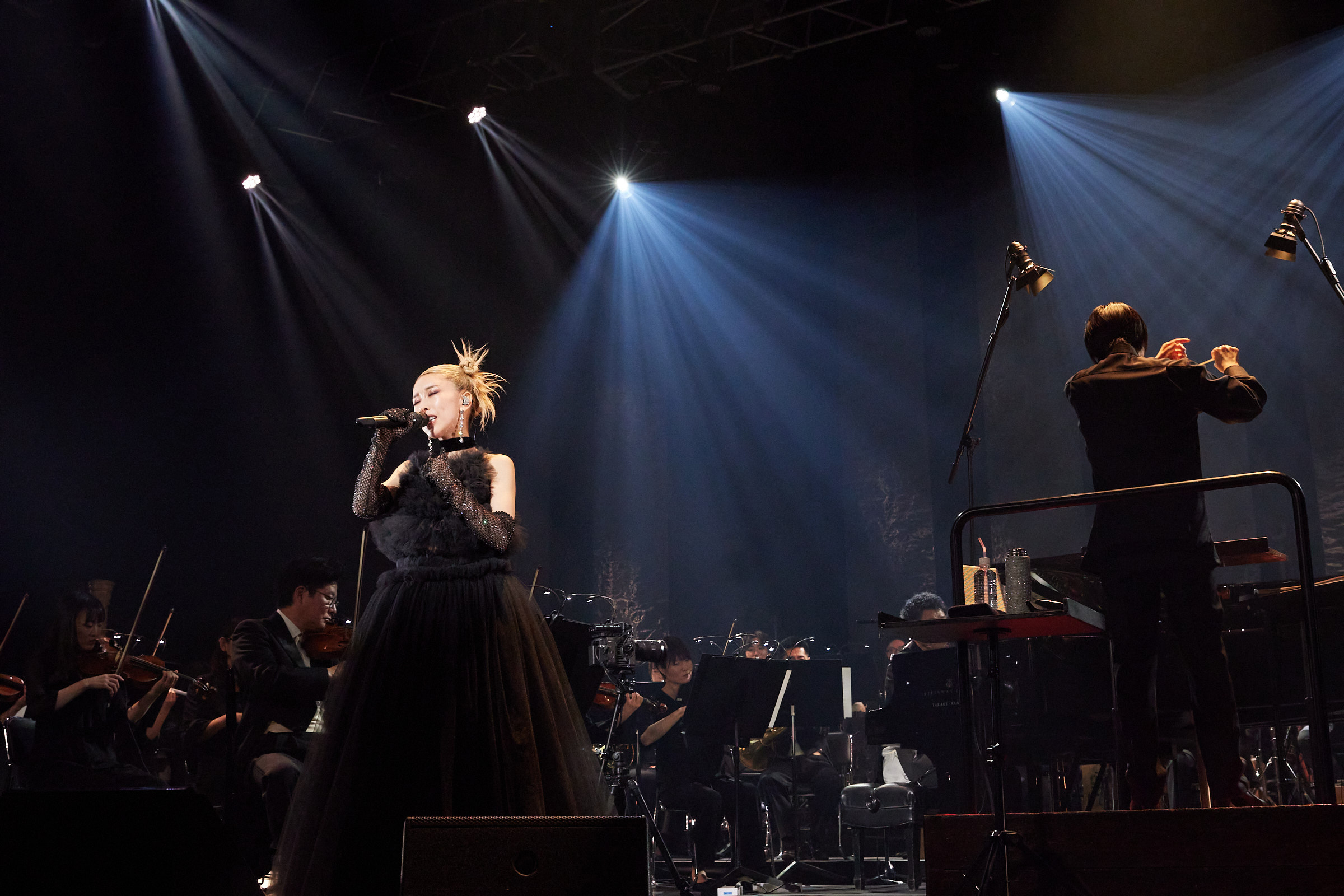 中盤には「私は女性として生きてきたことをすごく自覚している人間で、それを愛しているし、楽しんでいるし、時に悲しんでいる。日々格闘しているんですが、そんなときに自分を助けてくれるのは音楽だし、自分自身が音楽を始めたのも女性アーティストがきっかけでした」と語った。そしてMC明けには、影響を受けた女性アーティストのカバー曲として宇多田ヒカルの「First Love」をパフォーマンス。オーケストラの演奏をバックにマイクを両手で握りしめて歌う姿はとても美しく、リスナー全員の心を鷲掴みにする見事な歌声だった。言葉ひとつひとつに余韻があり、歌声と演奏を贅沢に浴びていることを実感した。