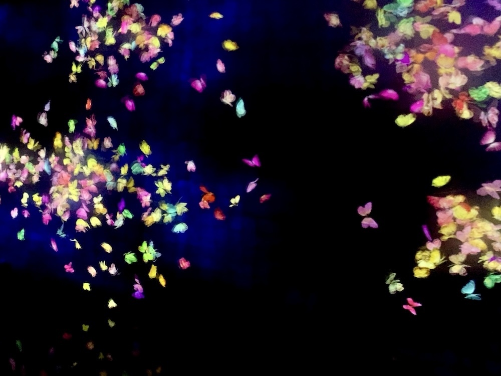 蝶ももちろん、触れると死んでしまう。「人に反応して〇〇が生まれる」と一緒に「人の振る舞いに反応して〇〇は死ぬ」がプログラムされているところが、チームラボの世界観を紐解くカギであるのかもしれない。西洋・東洋問わず、蝶は魂や精神の化身と言われるものだ。自分から生まれたモノが世界に放たれていき、何かしらの影響を及さずにはいられない……というのは、なかなか不気味な感覚でもある。ロマンとも言えるかもしれないけれど。ブワーッと蝶を生み出しながらつい考え込んでしまった。