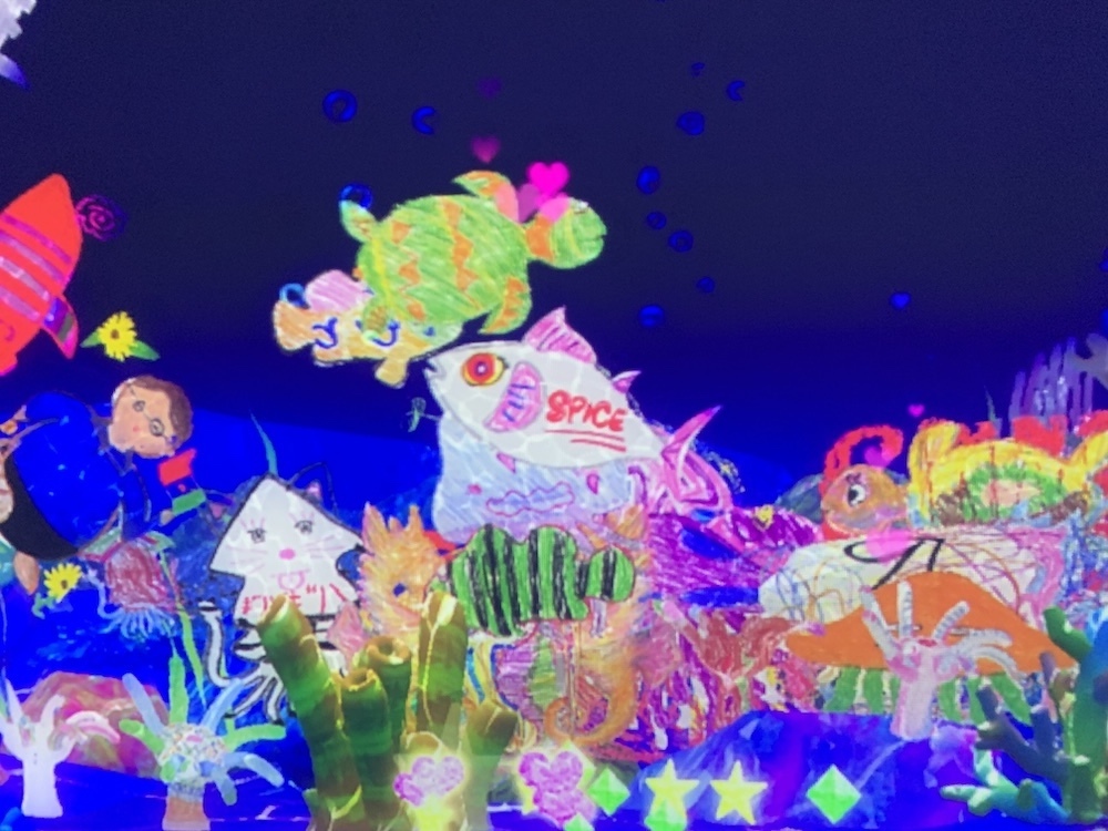 空間を泳ぎ回るカラフルな海の生き物たちは、すべて来場者が紙に描いたものだ。マグロにイカにクラゲにカメなど、各種の用紙とクレヨンが隣のお絵描きコーナーに用意されているので、思うままに描いてみよう。