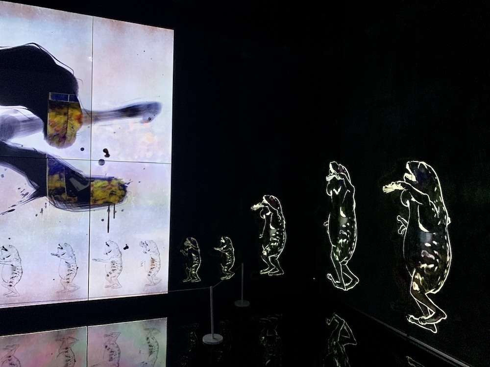 最後に、このミュージアムの伝えたいことを最も端的に表していると感じた一作を紹介したい。《追われるカラス、追うカラスも追われるカラス:虚空の宇宙》だ。本作は「虚空の宇宙」という真っ暗な窪みのようなエリアに立ち、体をすっぽり包まれる感覚で鑑賞する作品だ。どうしても時間がないという場合でも、個人的にこれだけは見たほうがいいと思う。縦横無尽に飛び回るカラスの姿は圧巻で、疾走感のある音楽と組み合わさることでブワッと鳥肌が立ってしまった。