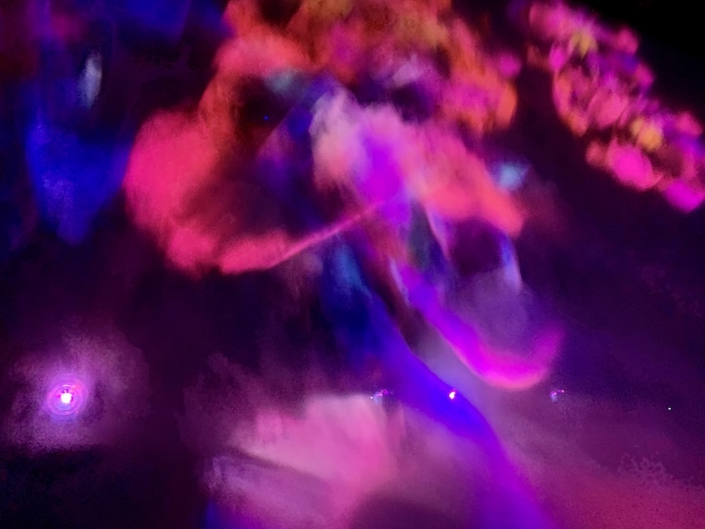 本館ではインタラクティブなデジタルアート作品のほかに、本来実体のないモノである“光を彫刻する”不思議な作品を見ることができる。例えば、こちらは展示空間いっぱいに粒子の細かいミストが満ち、そこに投影されたアートが風でゆらゆら揺れるような設えだ。