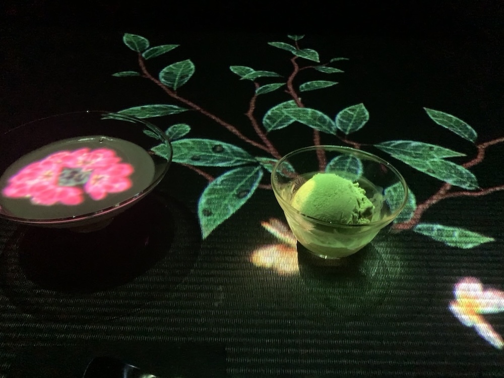 暗い茶屋内で、丁寧にサーブされるお茶と甘味。それだけでも疲れた体に染み渡るのに、ここではアート作品が宿ったお茶(甘味)をいただく、という特別な体験ができる。お茶には季節ごとに違う花が咲き、緑茶のジェラートからは茶の木が生え、蝶が遊びにやってくる。ちなみにこれは声を大にしてお伝えしたいポイントだが、両方ともとても美味しかった。きっと『EN TEA HOUSE』は大人気の一角になるに違いない。