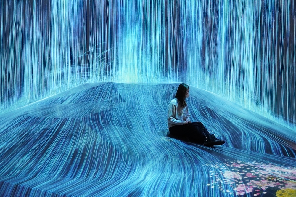 『チームラボボーダレス』を楽しむポイントは、「キレイなものを見つけたら、まずは立ち止まって、できれば触ってみる」である。デジタルテクノロジーを用いたアートたちは敏感に鑑賞者の気配を察知して、多彩な変化を見せてくれる。例えばこの《人々のための岩に憑依する滝》だったら、小高くなった部分に登ったり腰を下ろしたり、壁に張り付いたりしてみよう。本当に水流に入ったときのように、水のラインが身体を避けてうねっていく様子が見えるはずだ。