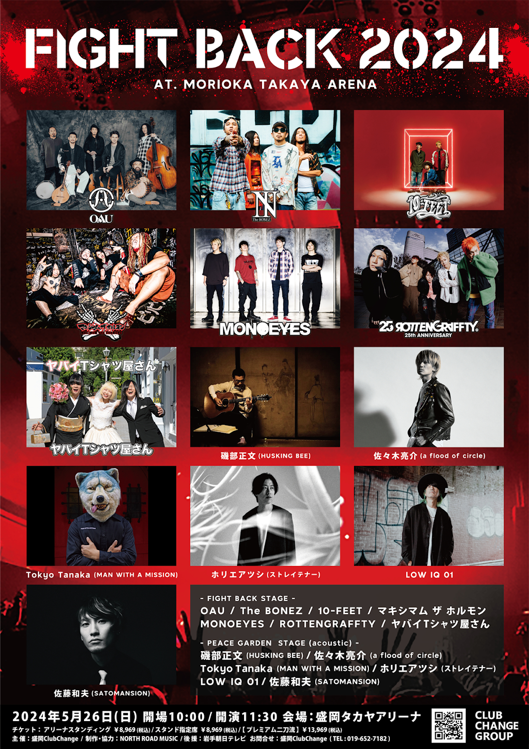 『FIGHT BACK』は、ライブハウス・盛岡ClubChangeの20周年を記念して、2022年12月に同会場にて開催されたアリーナイベントで、2年ぶりの開催となる。第1弾発表では、10-FEET、ROTTENGRAFFTYの出演が決定。今回の第2弾発表では、OAU、MONOEYES、ホリエアツシ(ストレイテナー)、LOW IQ 01の出演が決定した。