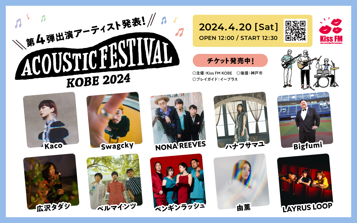 4月20日(土)に神戸の三宮・元町エリアで開催される、Kiss FM主催イベント『アコースティックフェスティバル』の第4弾アーティストとして、NONA REEVES、Bigfumi、広沢タダシら10組の出演が発表された。