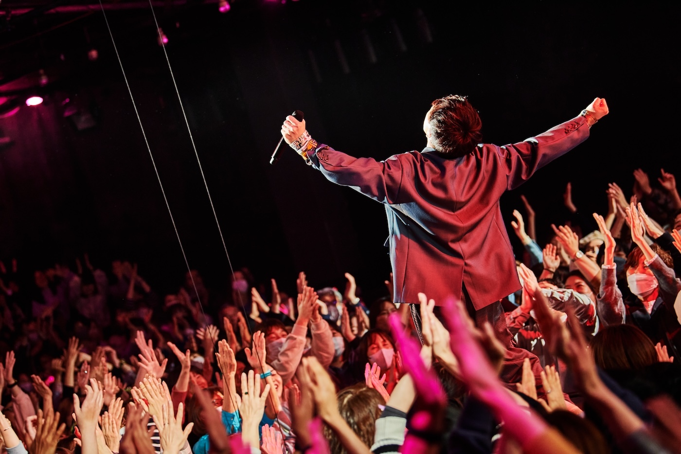 そのまま1曲目の「きみのため」が始まり、「レッツスタート!」の合図で巨大スクリーンが振り落とされる派手な演出の中、会場のボルテージも一気にあがる。「きみのため」間奏に乗せた「ハッピーバースデー」がバンドメンバーから贈られると、それにあわせてステージ上にバースデーケーキが登場。「まだ1曲目だよ!(ケーキ)早くない?!」と突っ込みながらもロウソクの火を吹き消して演奏再開、大歓声のなかセレモニー完遂となった。ブロックの最後には自身の代表曲でもある「葛飾ラプソディー」を披露し、「生まれてきてよかった」と噛みしめるシーンも。
