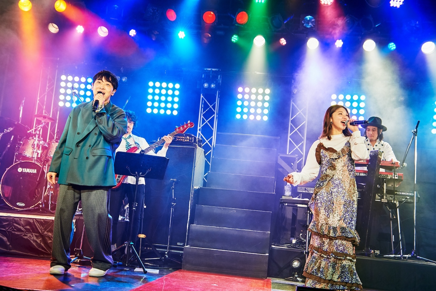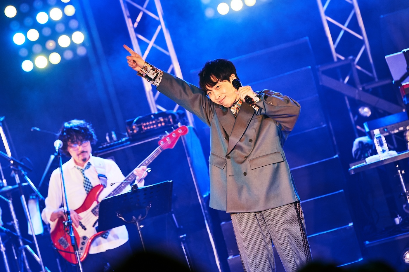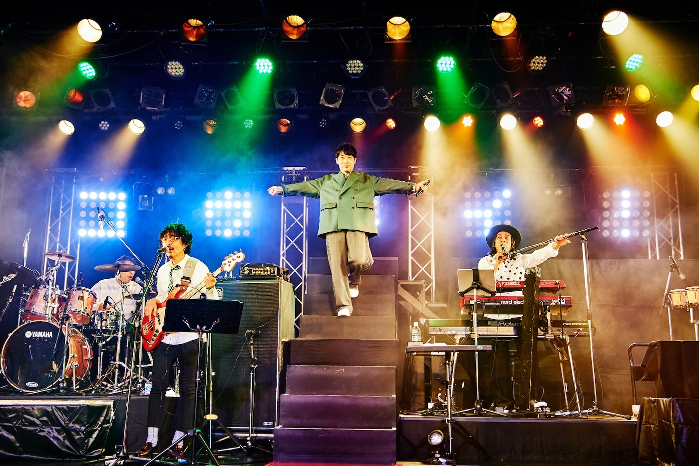 MCでは「20年ぶりに演奏する曲。当時もステージにコーラスで真城めぐみさんがいてくれた。それ伝えたら、真城さん覚えてなかったけど!」というエピソードを紹介しつつ、「流星カルナバル」を披露。その後、最新アルバム『FIT』から「月光地帯」「存在」を演奏し、グルーヴィーなイントロから始まる「ベンジャミン、空を睨む」のラストで今回の“お祝いゲスト”である元アンジュルムの竹内朱莉をステージに迎え入れた。