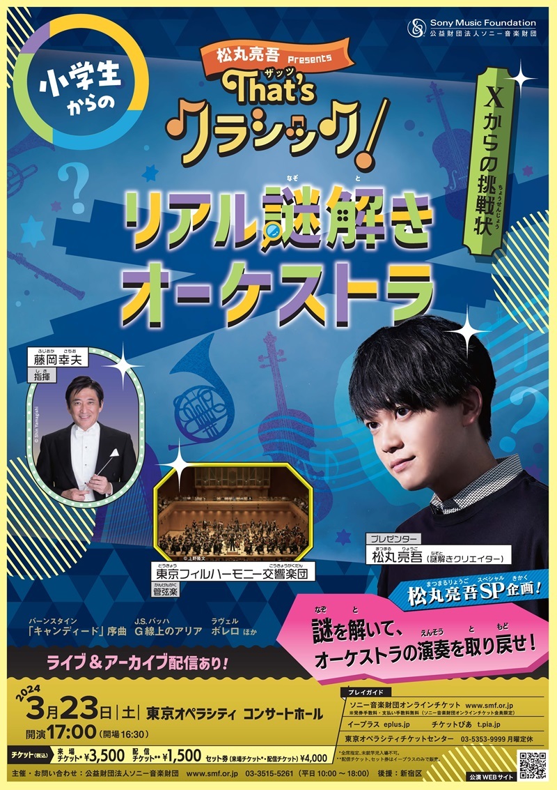 『Thatʼs クラシック!』は、「クラシックコンサートの常識を覆す」をコンセプトにソニー音楽財団が贈る新しい時代のコンサートシリーズ。3回目の開催となる今回は、小学生以上の子どもとその保護者を対象に、謎解きクリエイターとして活躍する松丸亮吾がプロデューサーとなり、「聴衆参加型の謎解き」と「クラシック音楽」の絶妙なコラボレーションが実現した。