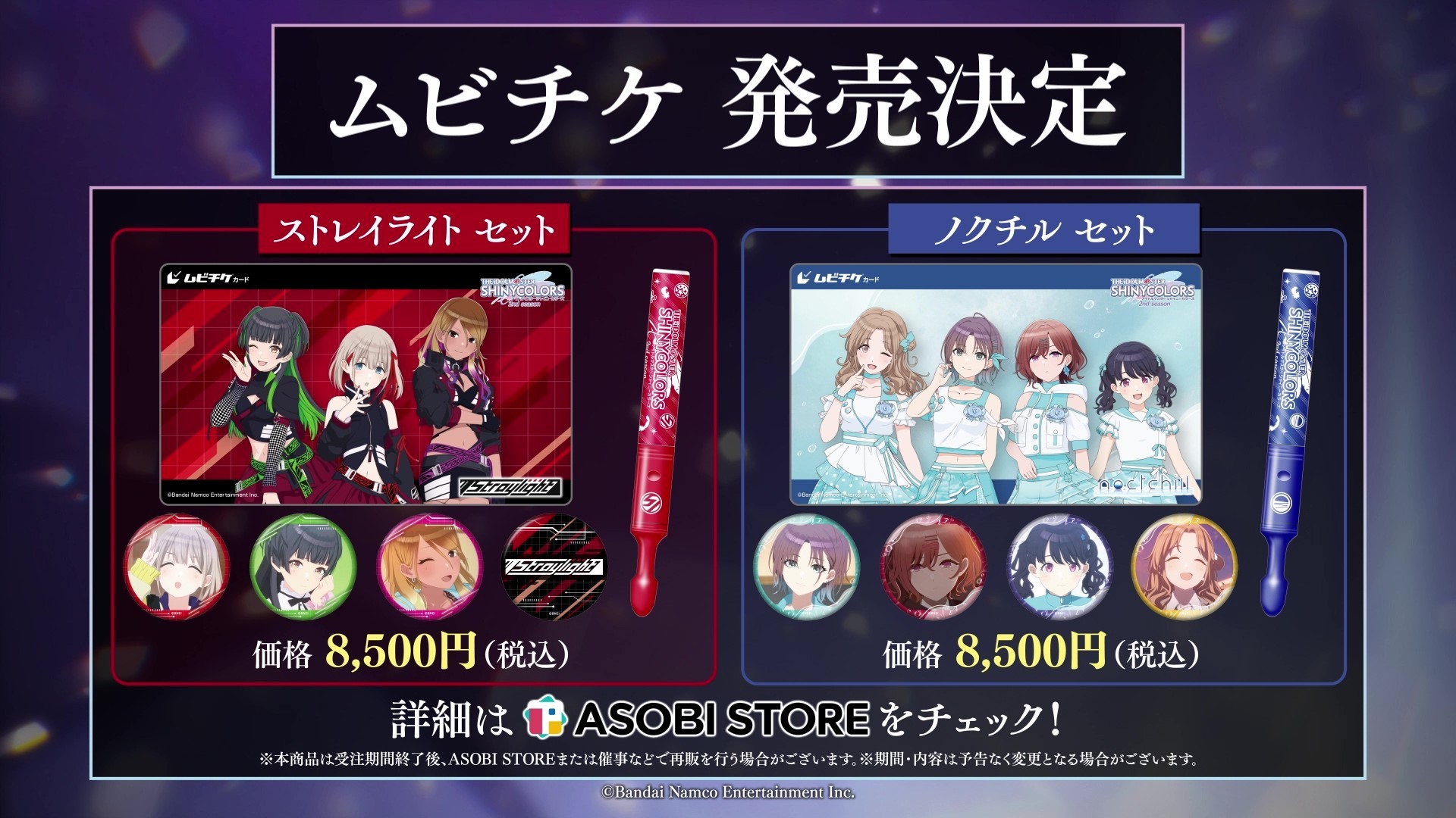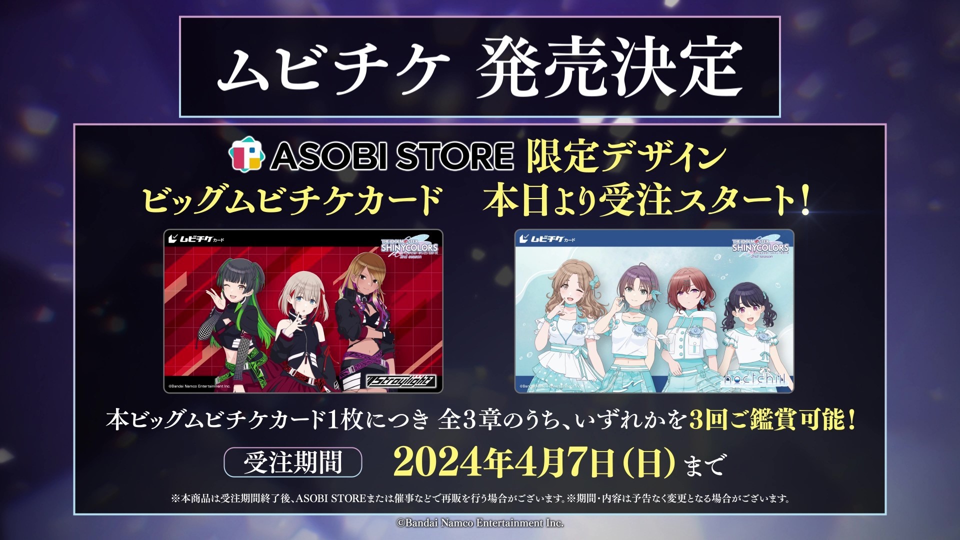 アソビストアでは「アソビストア限定デザインビッグムビチケカード」の受注が開始されており、2nd seasonから本作へ登場する「ストレイライト」と「ノクチル」の2ユニットのセットが用意されている。各ムビチケカードには、ユニットメンバーの場面写真をあしらった缶バッジとコンサートライトのセットになっている。