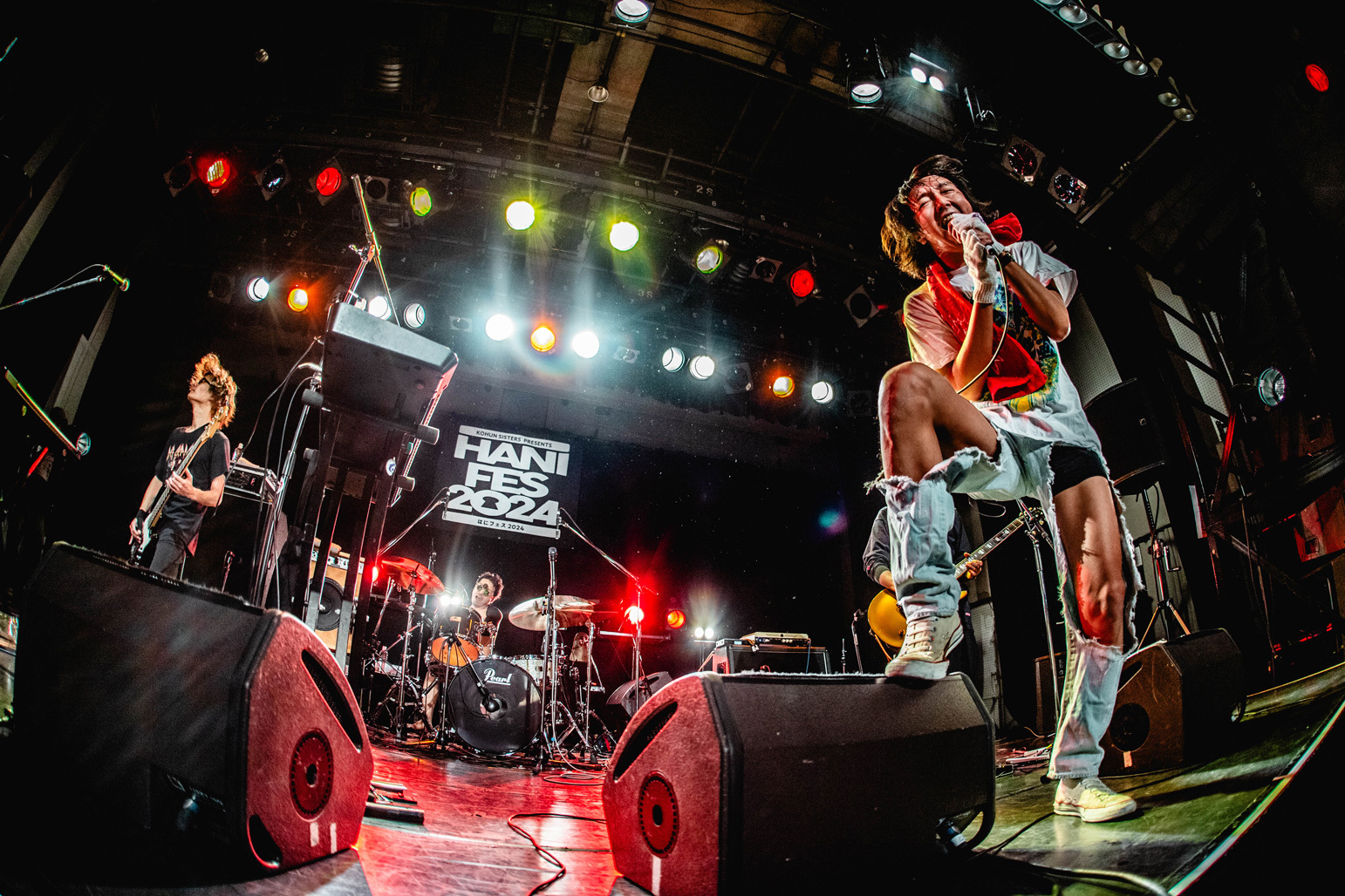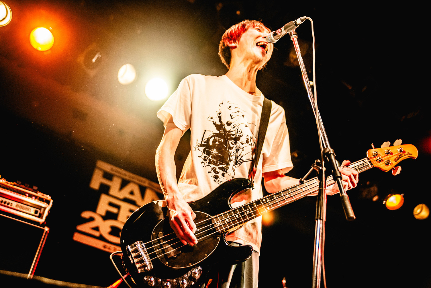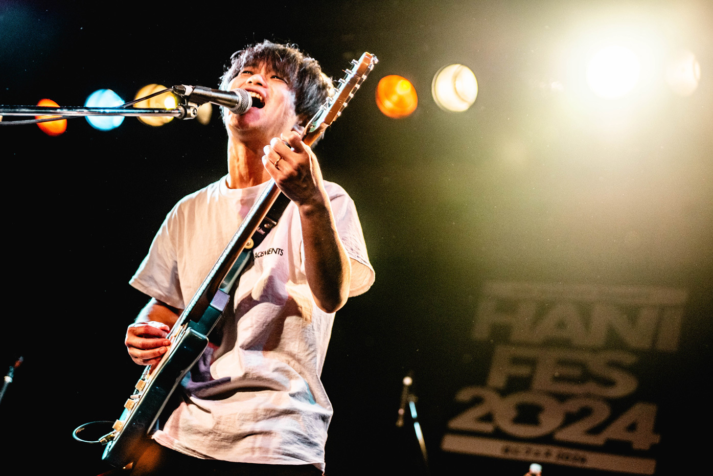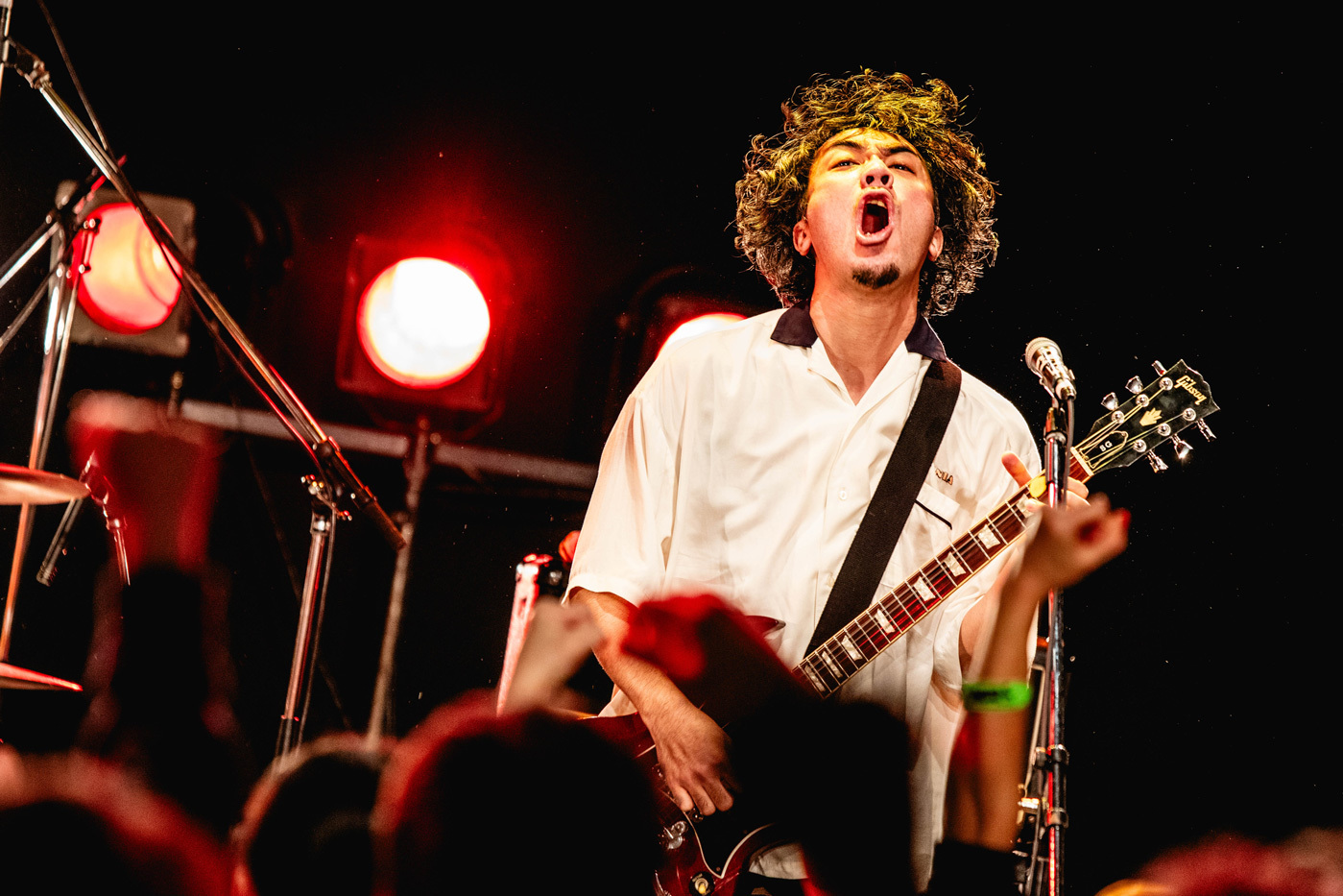 そして、2日間におけるトップバッターであるPRAY FOR MEが「愛媛のライバル!」と松山から紹介される。PRAY FOR MEは昨年『モンバス』にも初出場しており、この『はにフェス』にも同じ四国で鎬を削る同世代ライブバンドとしてトップバッターで出場してもらうのは、四国のライブハウスで開催するフェスとしての意思を感じる。メンバー3人からもとにかく気合いが伝わってくるし、ボーカルのタクマも「四国のバンドなのにちゃんと対バンしたことが無かったので、しっかりと決めます!」とより気合いを入れている。