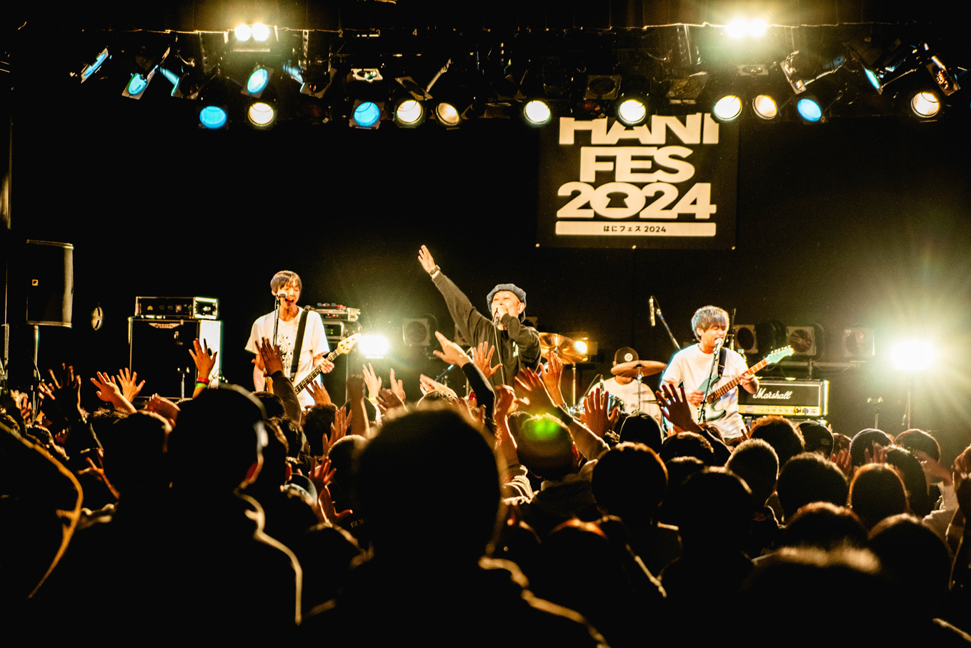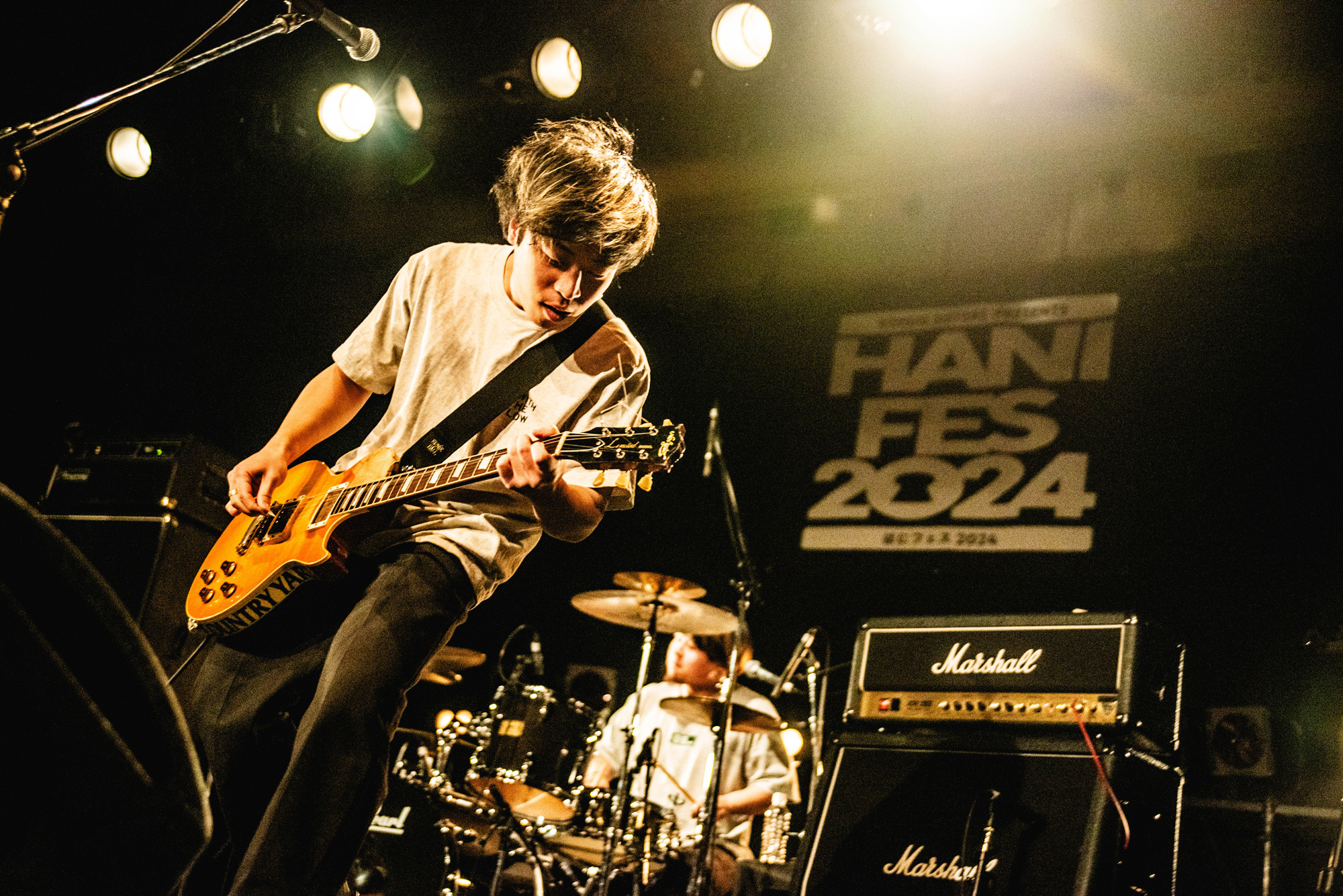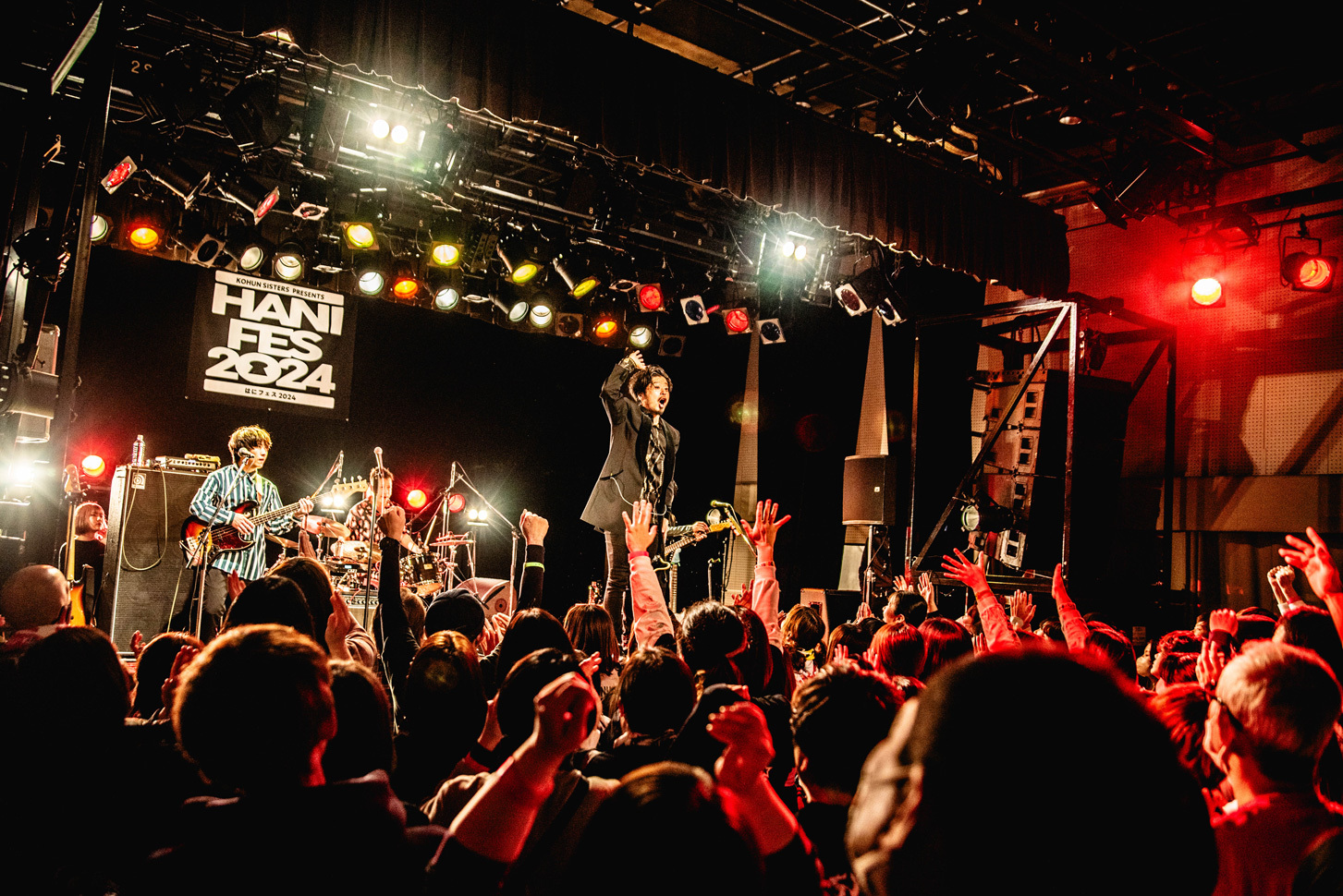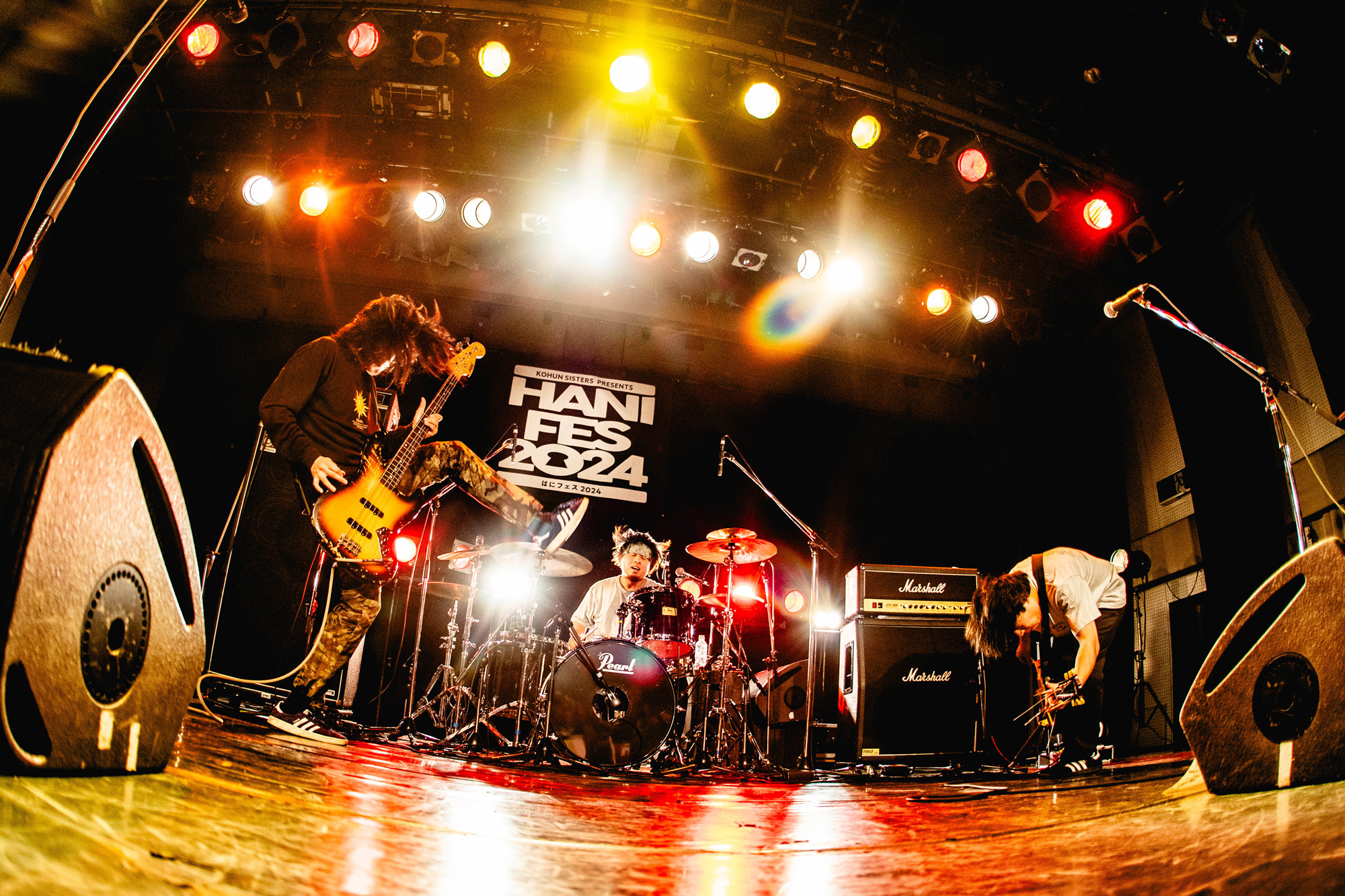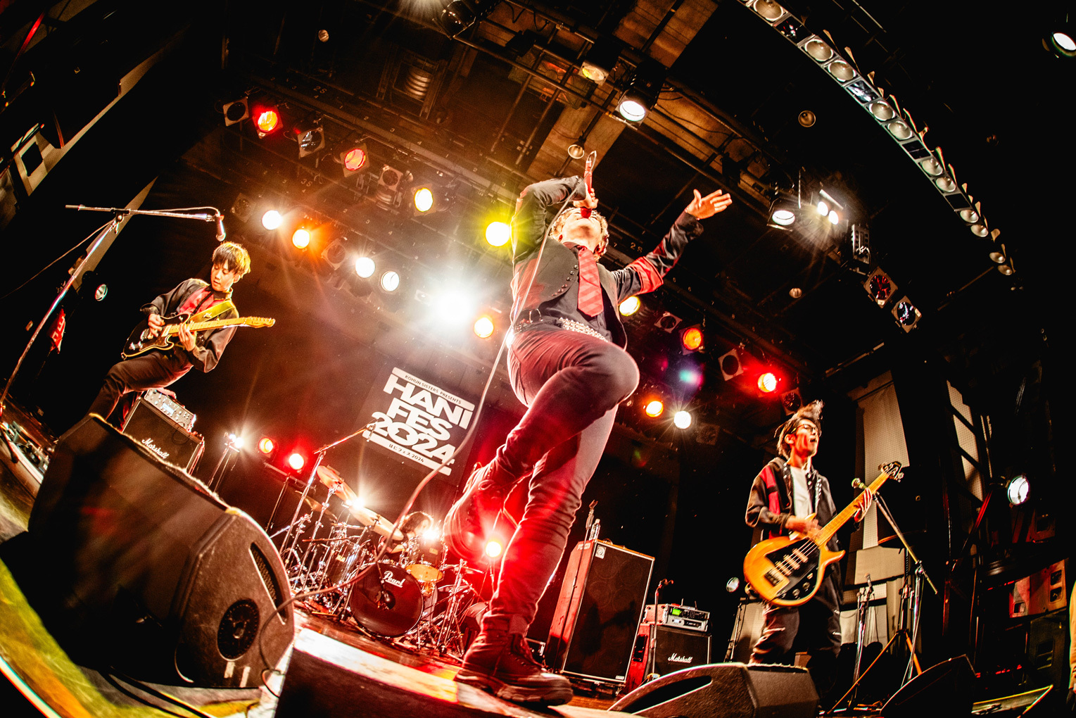 そして、2日間におけるトップバッターであるPRAY FOR MEが「愛媛のライバル!」と松山から紹介される。PRAY FOR MEは昨年『モンバス』にも初出場しており、この『はにフェス』にも同じ四国で鎬を削る同世代ライブバンドとしてトップバッターで出場してもらうのは、四国のライブハウスで開催するフェスとしての意思を感じる。メンバー3人からもとにかく気合いが伝わってくるし、ボーカルのタクマも「四国のバンドなのにちゃんと対バンしたことが無かったので、しっかりと決めます!」とより気合いを入れている。