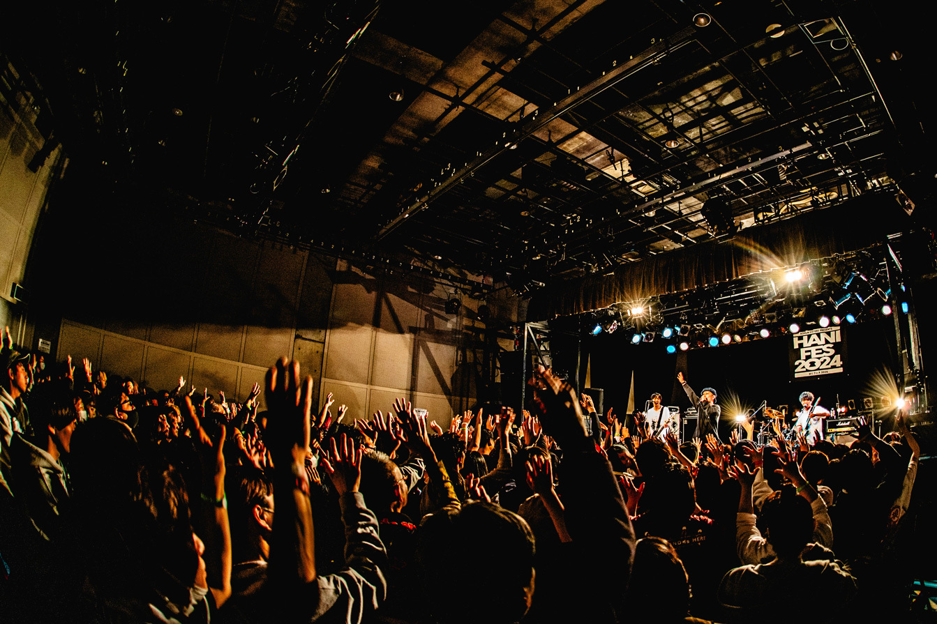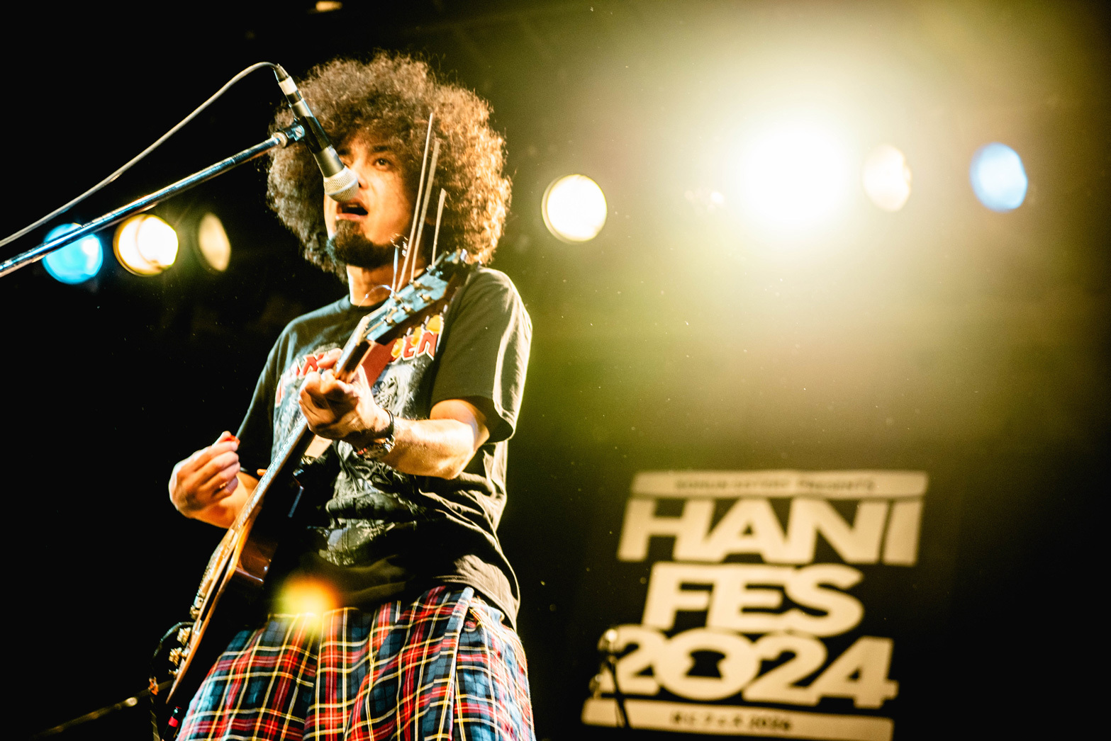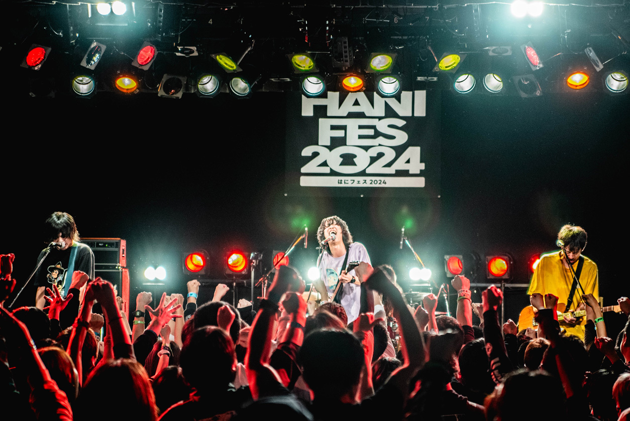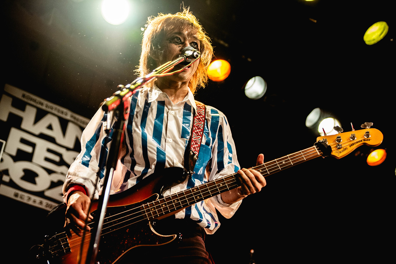そして、2日間におけるトップバッターであるPRAY FOR MEが「愛媛のライバル!」と松山から紹介される。PRAY FOR MEは昨年『モンバス』にも初出場しており、この『はにフェス』にも同じ四国で鎬を削る同世代ライブバンドとしてトップバッターで出場してもらうのは、四国のライブハウスで開催するフェスとしての意思を感じる。メンバー3人からもとにかく気合いが伝わってくるし、ボーカルのタクマも「四国のバンドなのにちゃんと対バンしたことが無かったので、しっかりと決めます!」とより気合いを入れている。