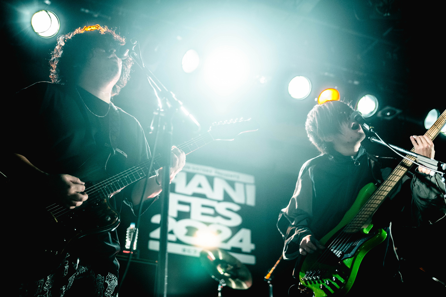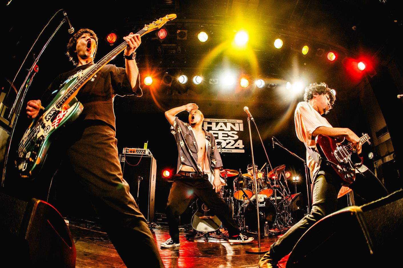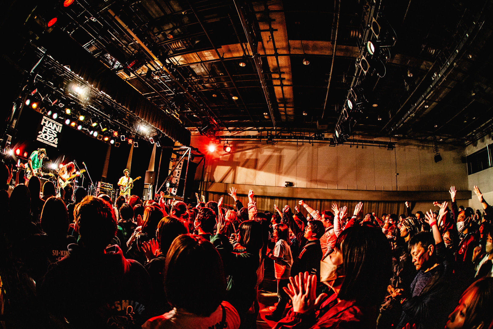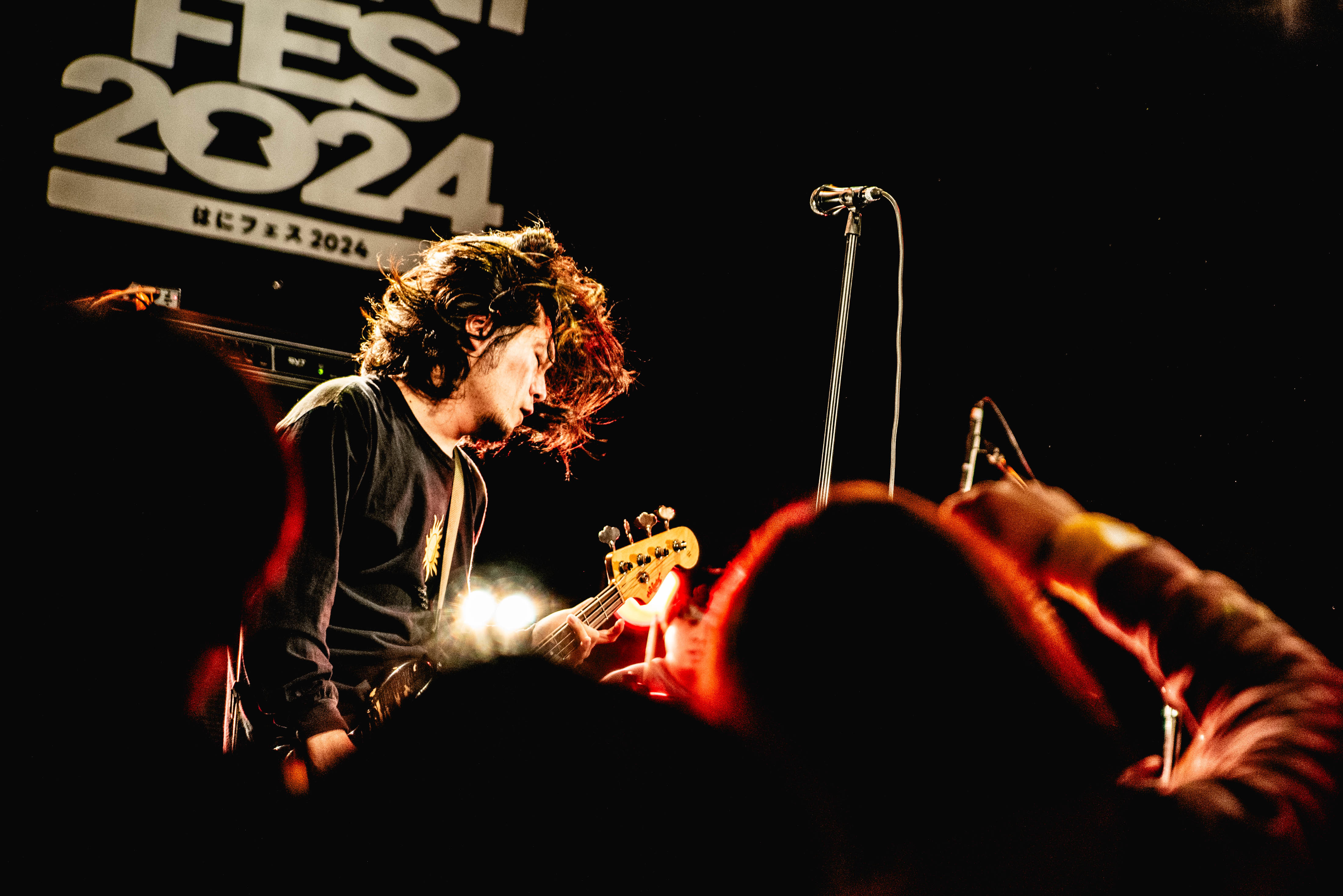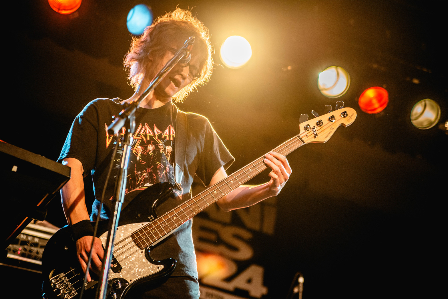 二番手はビレッジマンズストア。こちらもライブハウスで歴戦を重ねてきているだけあって、リハの段取りが早い。リハからライブ同様の音合わせをして、すでに観客を盛り上げている。2日間、2024年初ライブというバンドが多かったし、なので、より気合いが入っていたが、そんな中でもボーカルの水野による「いつでも(観客が)帰れるように、一番最高得点を二番手ですが出していきたい!」という言葉は良かった。