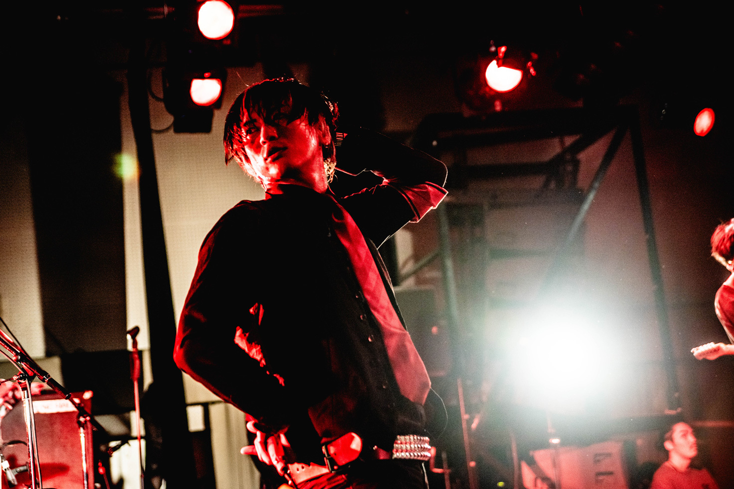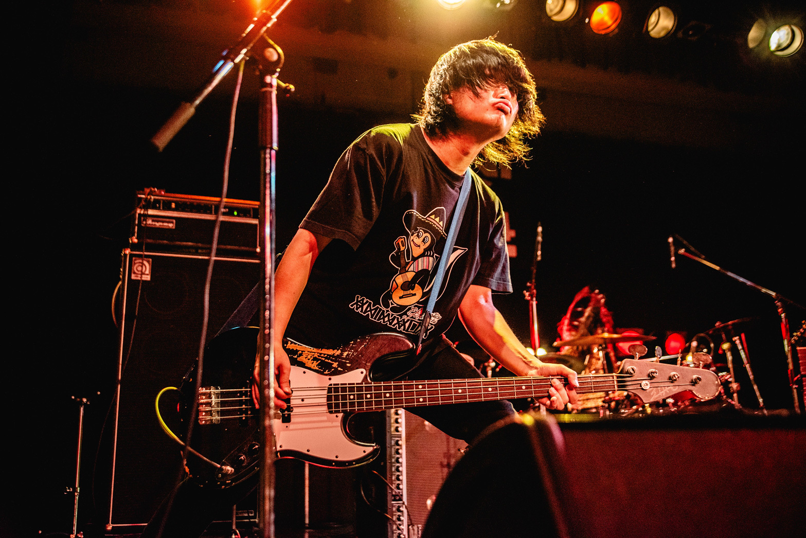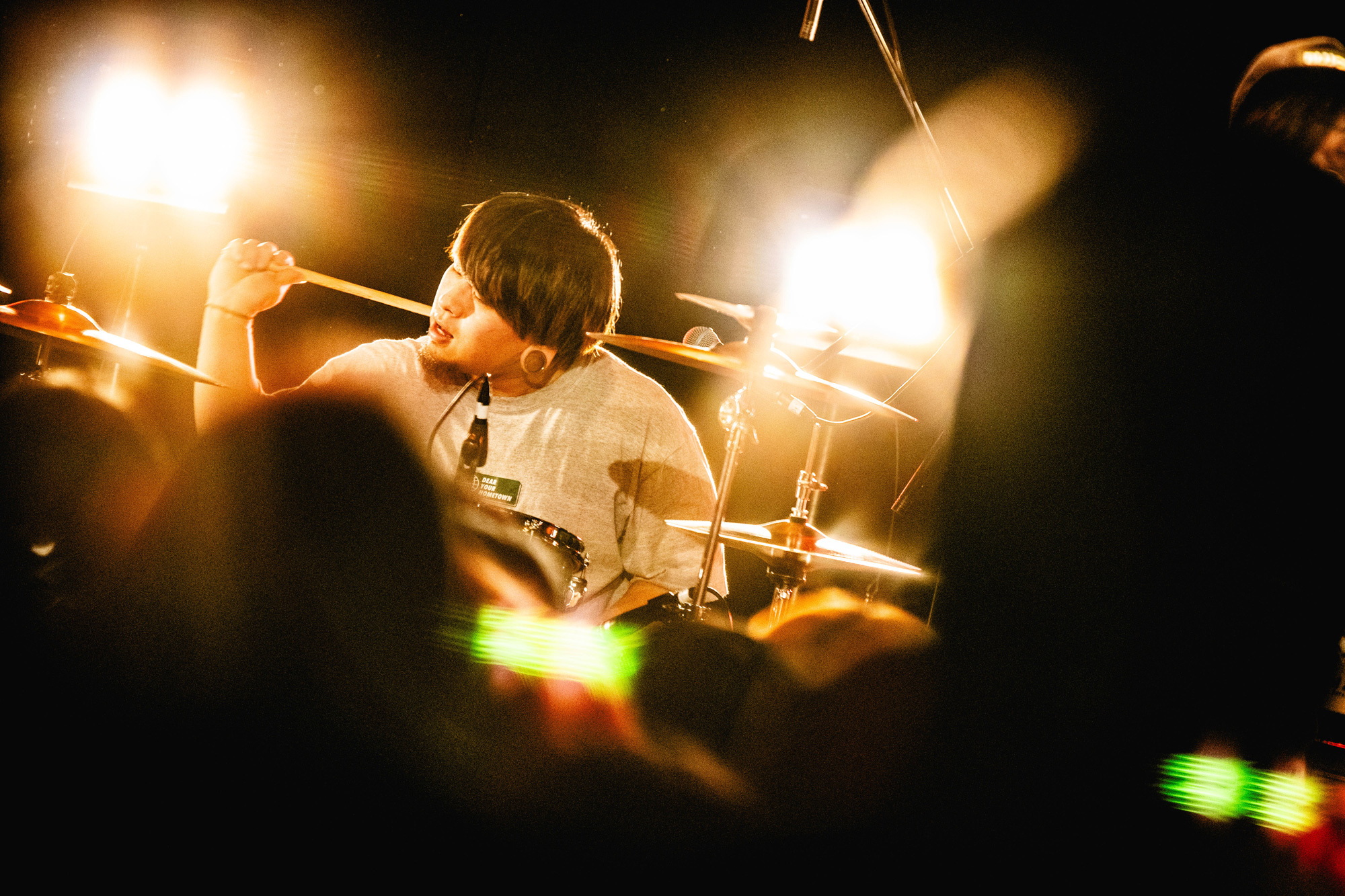 リハから松山は覚悟を決めたかのように決意表明をした。全組が古墳シスターズを格好良いと認めて盛り上げたからこそ、それが嘘ではないと魅せるためにと、まだリハであるにも関わらず、とにかく松山を始めとしてメンバー全員の気持ちが前面に出まくっている。そりゃ、あれだけのライブを6組分ぶちかまされ続けたら、サウンドチェックでも「どうでもいいので、全部大きくして下さい!」なんてPAスタッフにお願いするだろう。小細工無しで、よしんば恥であろうと何であろうと全てを曝け出そうという腹の括りっぷりは、観ていても気持ちが良かった。本番も当たり前だが、マグマが爆発した様な火を吹くような激しいライブ。とにかく全身全霊で爆発させるギタープレイから、松本のライブ姿を「火を吹く」と私は何度か表現しているのだが、この日はメンバー全員が火を吹いていた。人間ここまで追い込まれたら、火事場のクソ力というか……、もうグッチャグッチャでグッシャグッシャなライブなのだが、その荒々しさはもはや美しい。10年目の初期衝動を感じた。