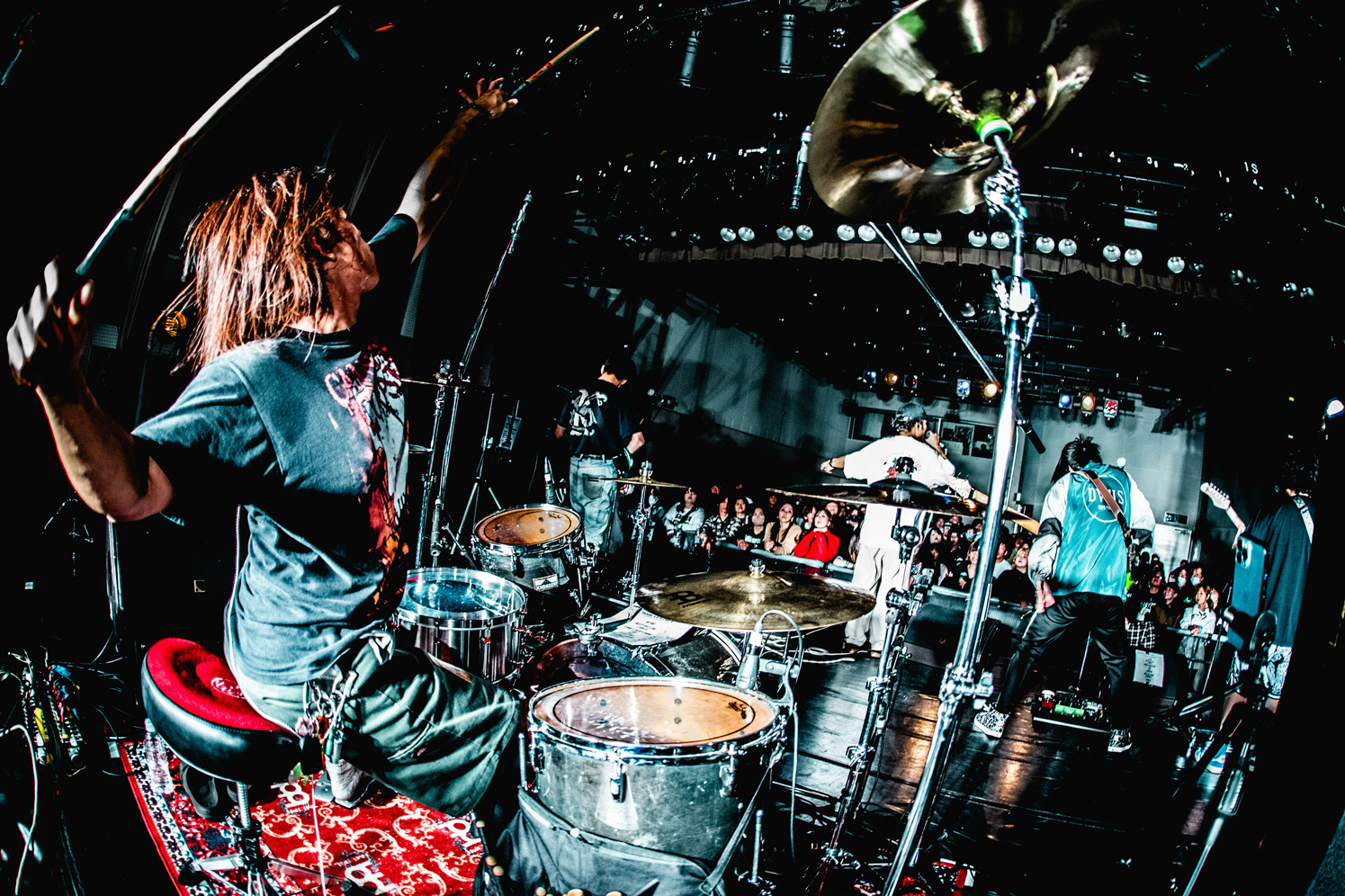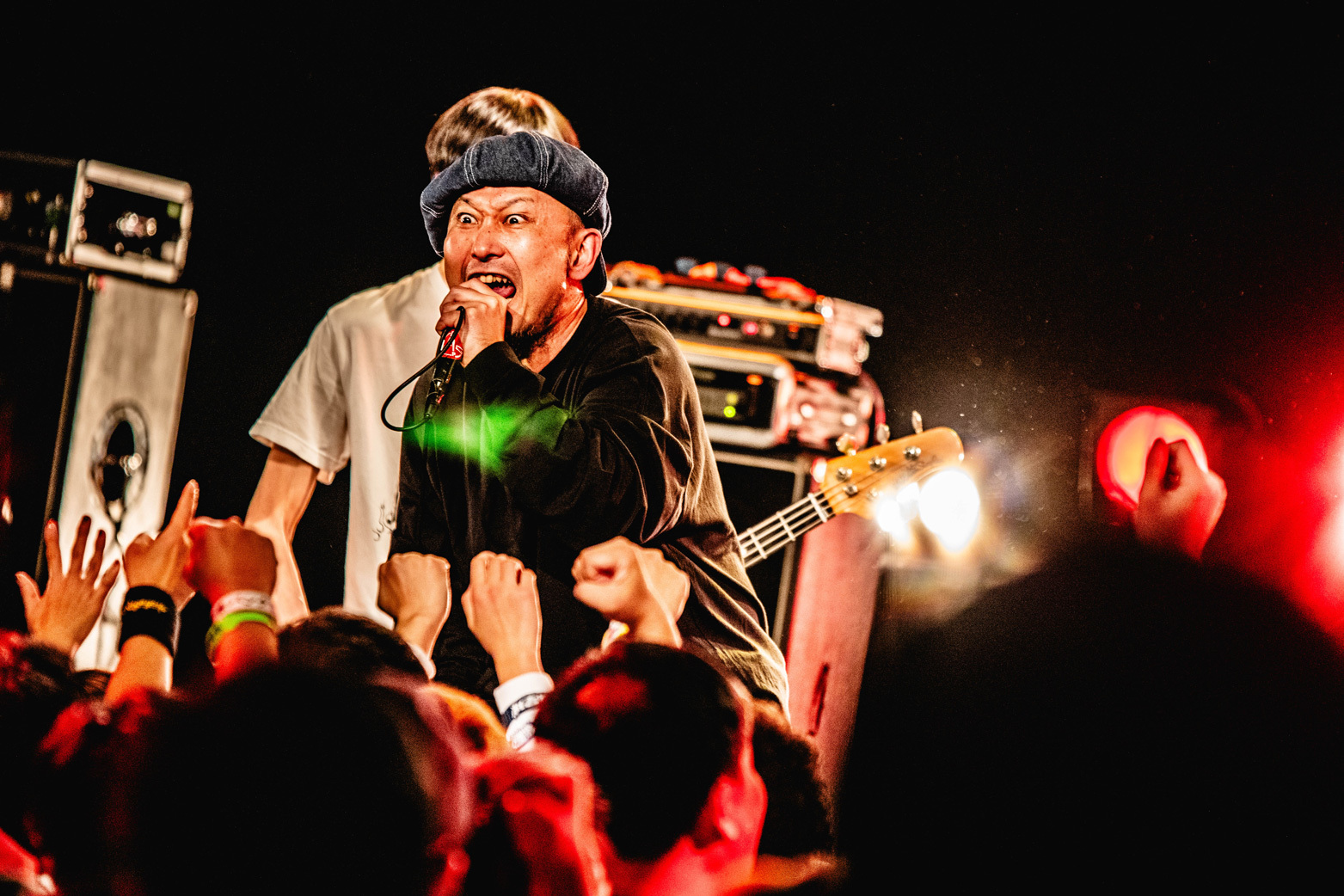 仲間である古墳シスターズのお祝いで来ているが、いざ舞台に上がったら、やるかやられるかの対戦である。それが対バンだ。まだまだ昼になったばかりなのに、観客も全力でサークルモッシュもヘッドバンキングもやりまくる。後、忘れていたが、2022年『サヌキロック』に彼らは出場するはずだったが、急遽出場できなくなり、その時に代打で出場したのが古墳シスターズだった。借りがあったからこそ今日の出場への打診に即答したらしい。ライブバンドマンシップならではの話だし、その繋がりがあるからこそ熱いライブをぶちあえるのだ。