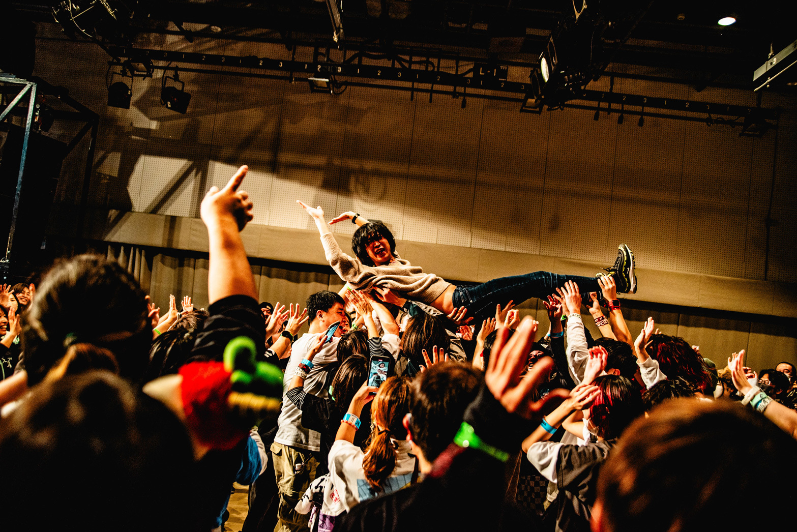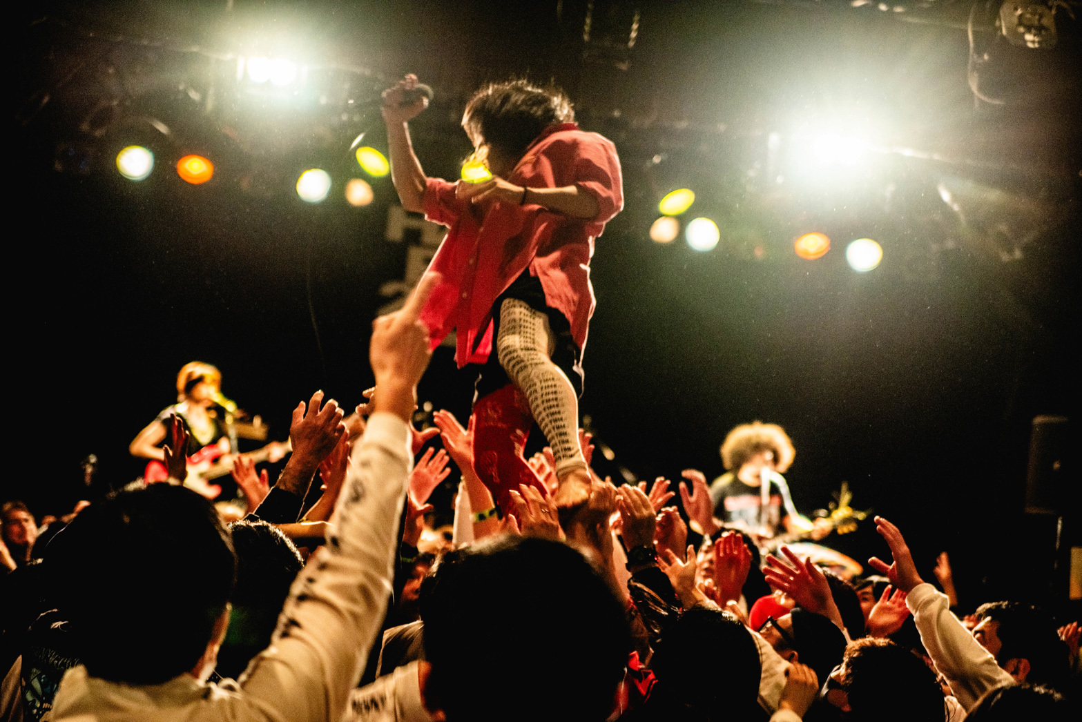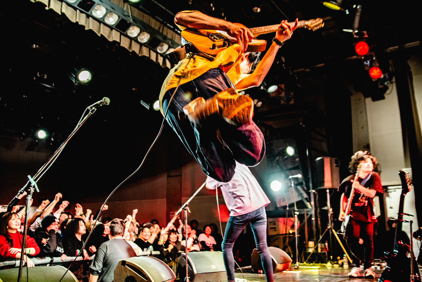 六番手はバックドロップシンデレラ。観客をフロアで二分してぶつかり合わせたり、ボーカルのでんでけあゆみは客の上にステージから前転しながら乗っかったり、客の上を歩いたり、これまた客の上をバックジャンプしてステージに戻って行ったりと、とにかく観客の上を自由自在に動き回っている。これ、別にあゆみが特別なことをしているわけではなくて、この2日間バンドマンたちは当たり前のように観客の上でダイブしたりと自由に動き回っていた。ライブハウスという空間で、ライブハウスに慣れている観客が多いからこそ成り立つ伝統芸であるし、場所によっては禁じられる場合もあったりするが、やはりここはライブハウス。ライブハウスでしか観れない光景をたくさん観れて、むちゃくちゃ大満足であった。