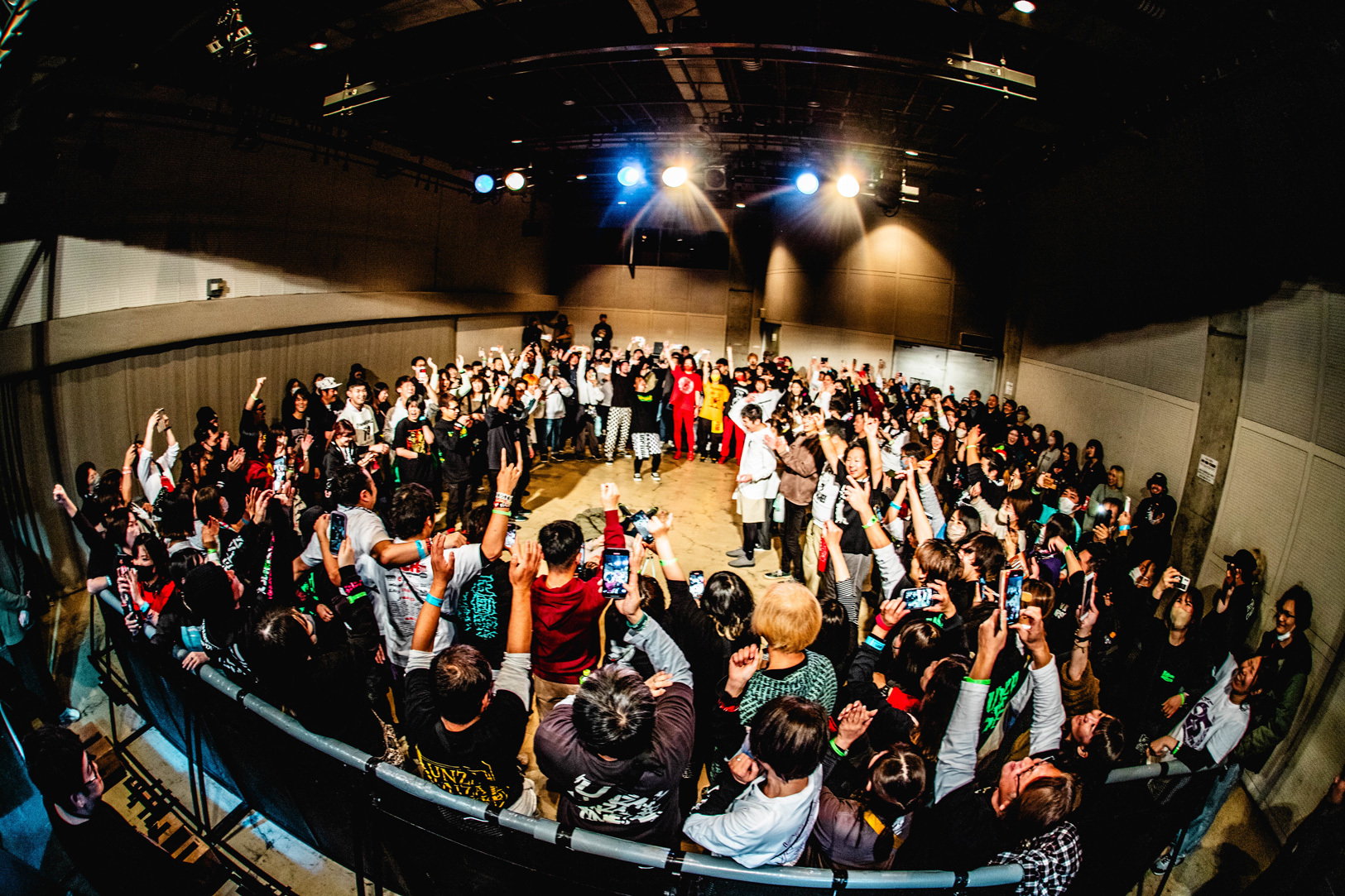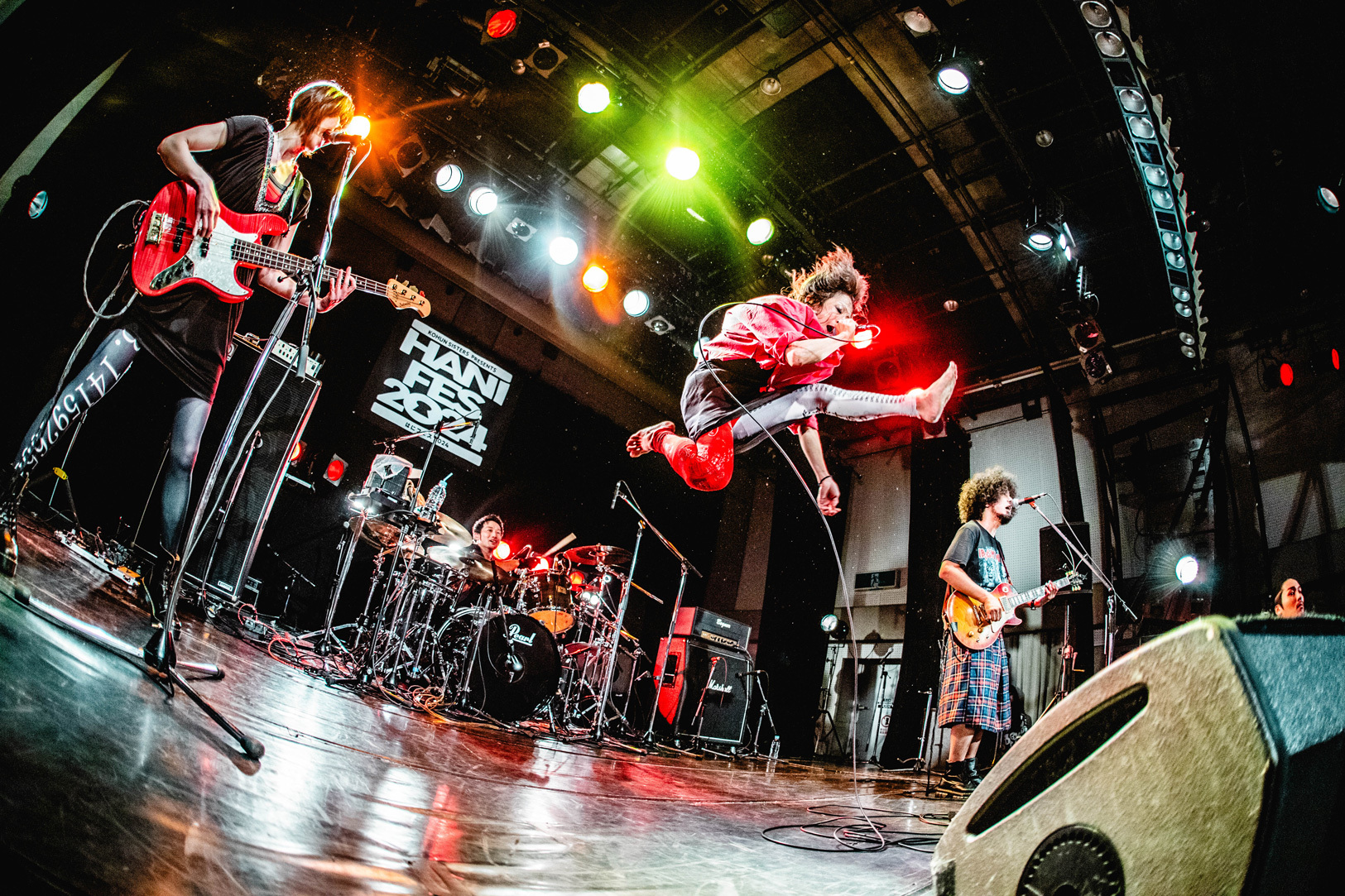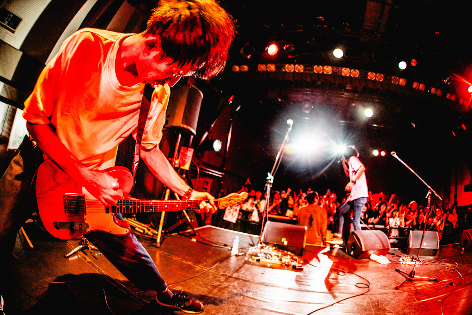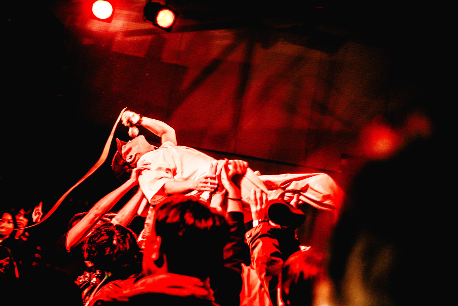 六番手はバックドロップシンデレラ。観客をフロアで二分してぶつかり合わせたり、ボーカルのでんでけあゆみは客の上にステージから前転しながら乗っかったり、客の上を歩いたり、これまた客の上をバックジャンプしてステージに戻って行ったりと、とにかく観客の上を自由自在に動き回っている。これ、別にあゆみが特別なことをしているわけではなくて、この2日間バンドマンたちは当たり前のように観客の上でダイブしたりと自由に動き回っていた。ライブハウスという空間で、ライブハウスに慣れている観客が多いからこそ成り立つ伝統芸であるし、場所によっては禁じられる場合もあったりするが、やはりここはライブハウス。ライブハウスでしか観れない光景をたくさん観れて、むちゃくちゃ大満足であった。