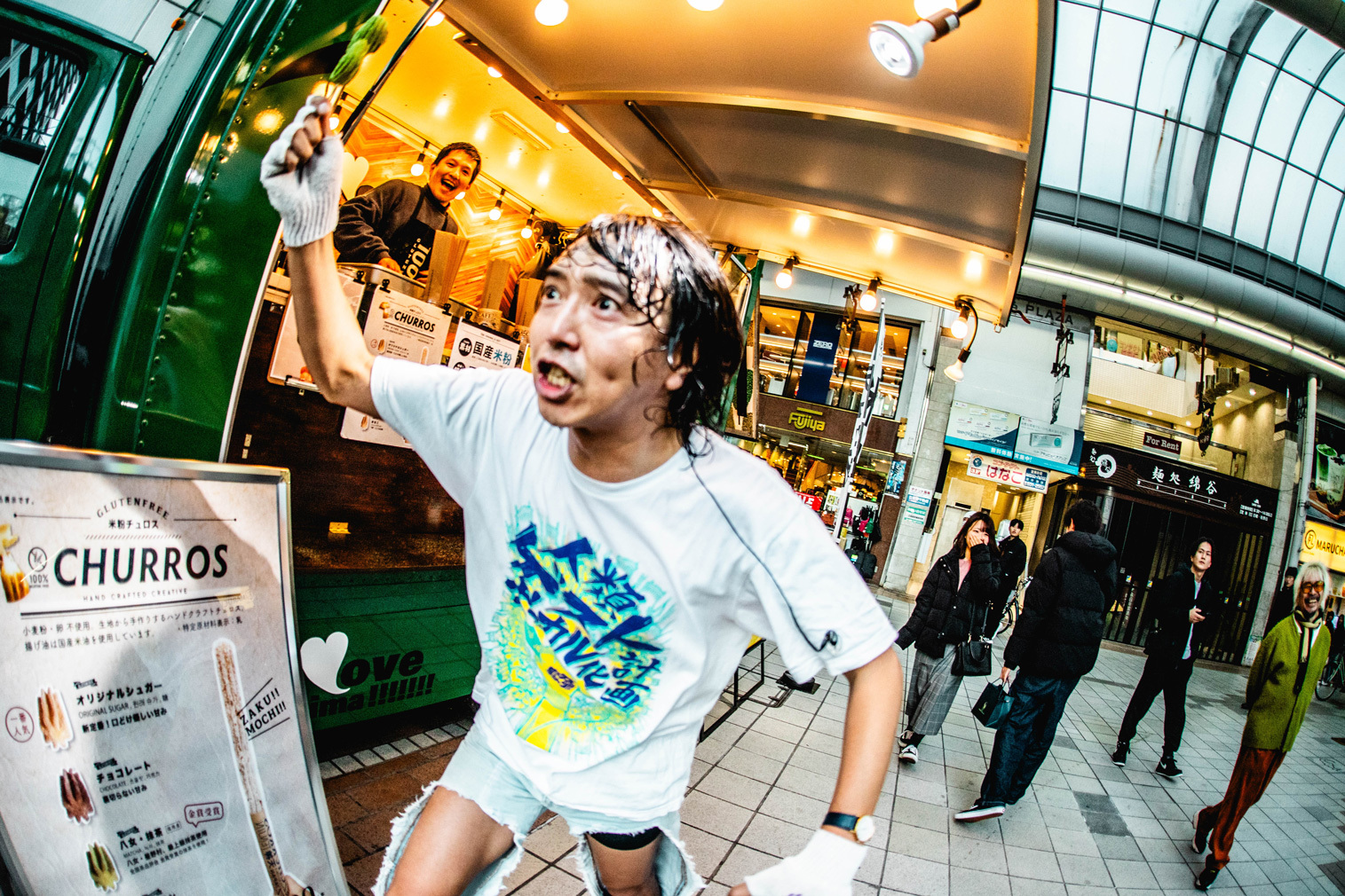 約80mというマイクコードの長さがあるスペシャルすぎるマイクを持つモーリーは、3階のライブハウスから1階の受付、そして隣接するキッチンカーまで行き、古墳チュロスを買って、3階のステージに戻って来る大技飛び技をぶちかます。古墳チュロスをマイクに見立てて叫んでいるし、もう圧倒的な存在感としか言いようが無い。結果、5分巻いて始まったのに、持ち時間ギリギリまで使い切っていた。古墳シスターズ出番の直前では無いとはいえ、古墳シスターズにとって、松山にとって、とびきり刺激になるライブだったはず。