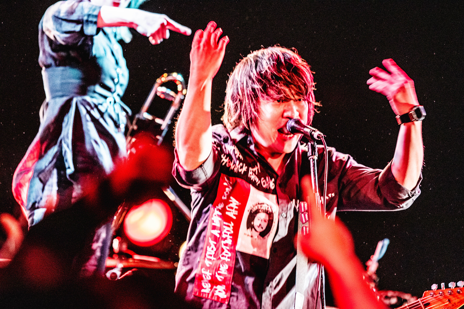 五番手は神戸のガガガSP。日本最古の青春パンクバンドであり、平成最後の青春パンクバンドと名乗る古墳シスターズにとっては、自分たちの大ルーツ。コザック前田は「ちょっとだけよ! 先っぽだけ!」と言いながら、リハから人気曲「つなひき帝国」をぶちかまして、あっという間に観客を掴み、その馬力を魅せつける。それでも、この後に控えた弟分の四星球の名前を出して、「四星球目当てのお客さん覚悟しといてください!!」と茶目っ気たっぷりに言って、本番に向けて一度袖へと去る。勿論、敢えてのライブジョークであることはわかりきっているが、どう考えてもリハから観客の心を鷲摑みしているのに、それでも自分たちはまだまだだという向上心を持ち続けていて、自分自身を鼓舞し続ける姿勢には恐れ入る。いつもぶちかましてくれているが、この日はいつも以上にぶちかましてくれる予感がとてつもなくあった。