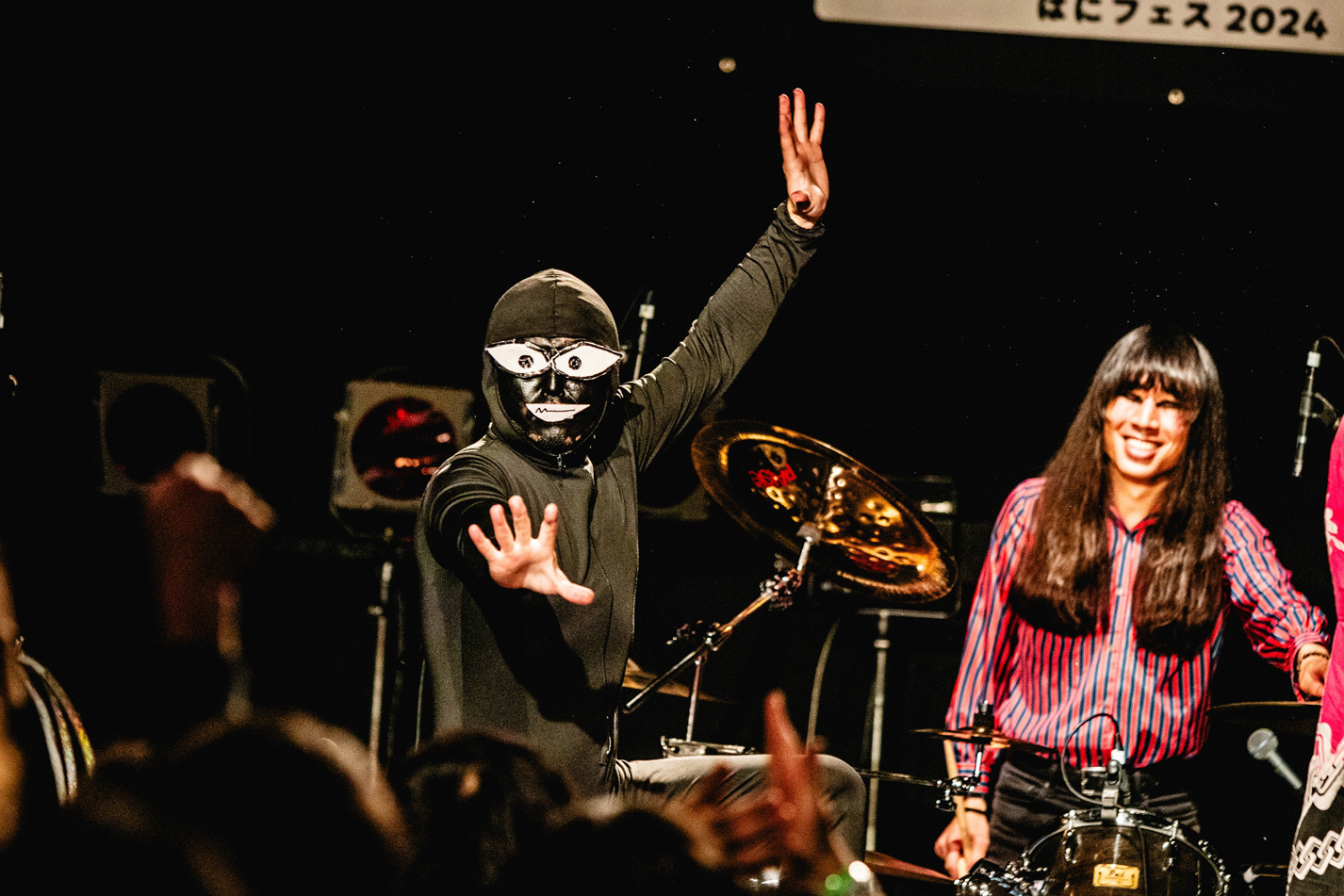 六番手は四星球。康雄は「ガガガ音頭」の威力を始めとして、これまでに出場したバンドたちの凄みを振り返りながら、古墳シスターズが自分たちのフェスやイベントを手伝ってくれていることを明かす。中でもドラムのラースが特に手伝ってくれていることを話した上で、「四星球、2024年一発目ライブはラースのドラムソロから始まります!」と呼び込む。本当にラースがドラムソロを鳴らす中、長髪に目の周りを黒く塗ったラースの特徴を生かしたコスプレで、U太とまさやんが、それぞれローソンラース&落ち武者ラースという謎のオリジナルキャラクターで登場! そこにモリスが逆ラースという目以外が全て真っ黒という黒の全身タイツ姿で登場! 『名探偵コナン』でお馴染みの黒い犯人を彷彿とさせるが、説明し出したら文字数が足りないくらいの手の込みよう……。