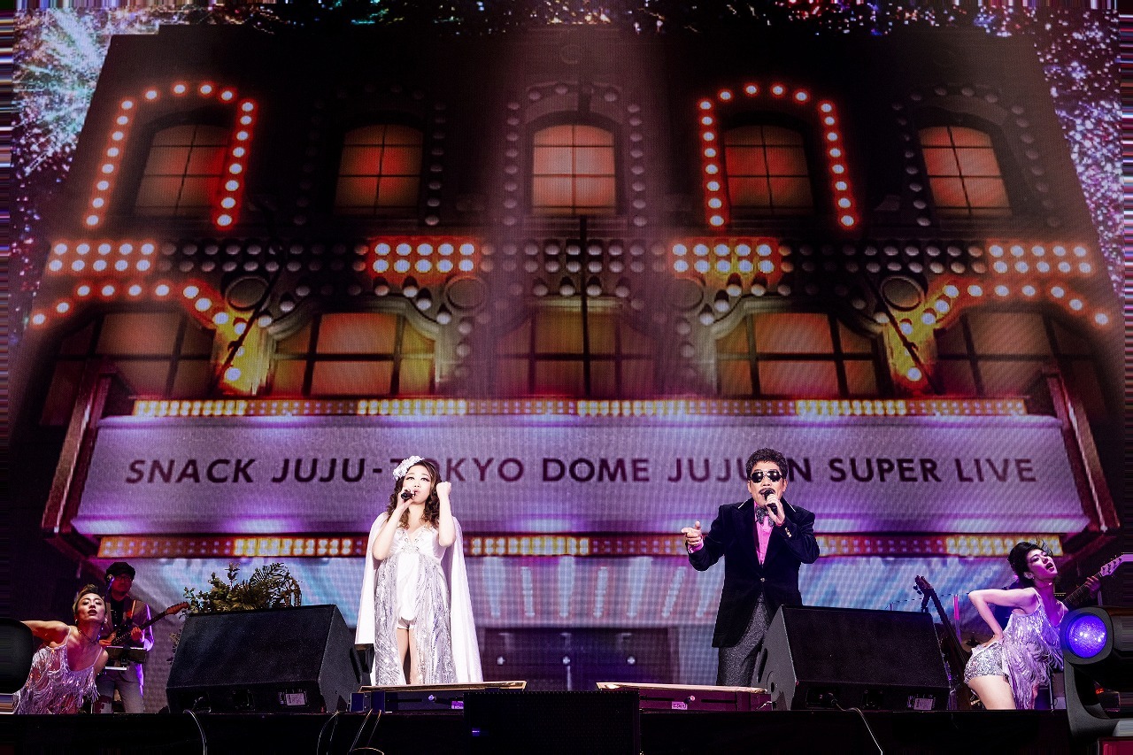 大人のムードと懐かしい昭和歌謡の名曲を求めるほろ酔い気分の観客で、広い“お店”は最上階スタンドの隅に至るまでぎっしり満員だ。2月17日、『-ジュジュ苑スーパーライブ-スナックJUJU 東京ドーム店』。大人気シリーズの最新アルバム「スナックJUJU ~夜のRequest~『帰ってきたママ』」と、JUJUのデビュー20周年を兼ねて実現した一夜限りの特別営業。夕闇迫る午後5時、馴染みのネオンに灯がともる。スナックのボーイ、声優の神尾晋一郎がママの到着を告げる。史上最大のスナック、いざ開店。