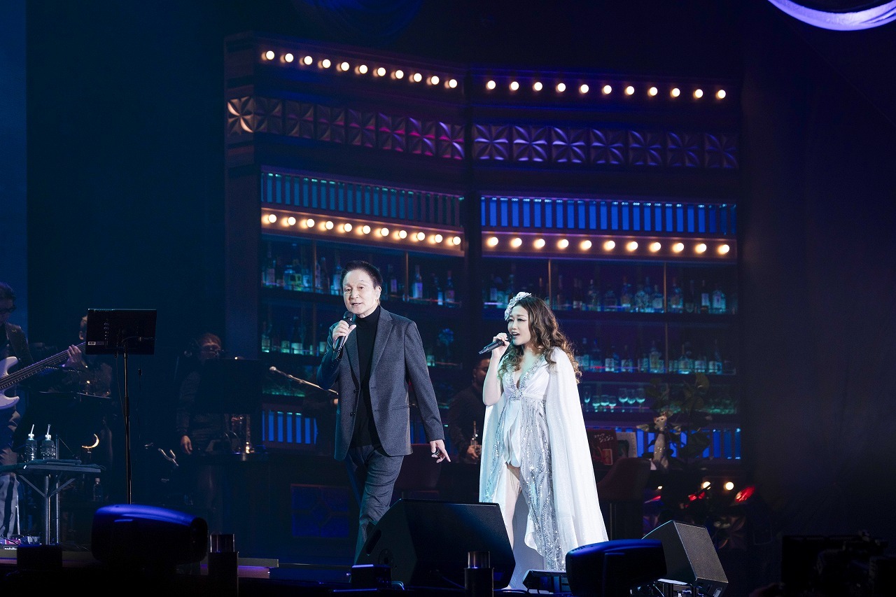 可愛い子猫ちゃんダンサーズに目移りするダンスタイム、「CHA-CHA-CHA」でぐっと熱気が高まったところへ登場した、この日最初のスーパーゲストは鈴木雅之だ。粋なピンクのシャツ、黒のジャケットに蝶ネクタイ、ママを優しくエスコートして「め組のひと」から「違う、そうじゃない」、そして再び「め組のひと」へ。ノリノリで煽るバンド、ソウル溢れる歌声、“ラヴソングの王様”と“宇宙で一番ピンヒールが似合う人”(by鈴木雅之)とのデュエット、これは盛り上がらずにいられない。手を取り合って歌うシーンが印象的な「ロンリー・チャップリン」まで、華やかで贅沢な時間は一瞬だ。