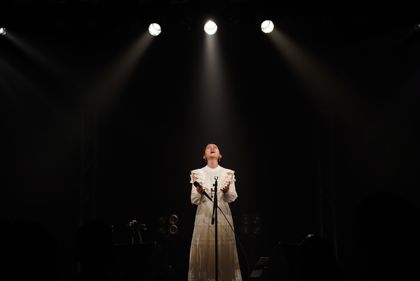 波の音が流れる中でアカペラから始まった「月」は、彼女の美しい歌声が会場全体を包み込み、まるで月夜の下で聴いているような神秘的な雰囲気となっていた。