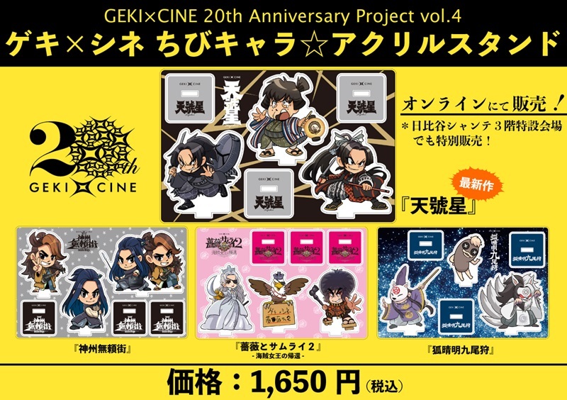 そのほか、ゲキ×シネ20周年を記念して、ゲキ×シネオリジナルグッズ「ちびキャラ☆アクリルスタンド」が特別販売されることが決定。ちびキャラは、ゲキ×シネ『狐晴明九尾狩』公開時に初めて誕生したもので、以降『神州無頼街』、『薔薇とサムライ2−海賊女王の帰還−』のゲキ×シネ公開時にも作品のキャラクターに因んだ可愛いちびキャラたちが続々誕生している。今回は、ゲキ×シネ最新作『天號星』でも、古田新太演じる藤壺屋半兵衛〈ふじつぼや はんべえ〉と、早乙女太一演じる宵闇銀次〈よいやみ ぎんじ〉、そして早乙女友貴演じる人斬り朝吉〈ひときり あさきち〉のちびキャラが初お目見えとなる。