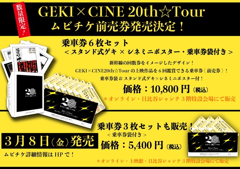 さらに、『GEKI×CINE 20th☆Tour』の乗車券(ムビチケ前売券)の発売も決定。新幹線(新感線)の回数券をイメージしたデザインだ。Tourの上映作品をお得に楽しめる6枚セット(10,800円(税込))、3枚セット(5,400円(税込))の2種類を、乗車券を封入する乗車券袋付きで3月8日(金)より販売。さらに、乗車券6枚セットにはスタンド式ゲキ×シネミニポスターが購入特典としてもれなくプレゼントされる。