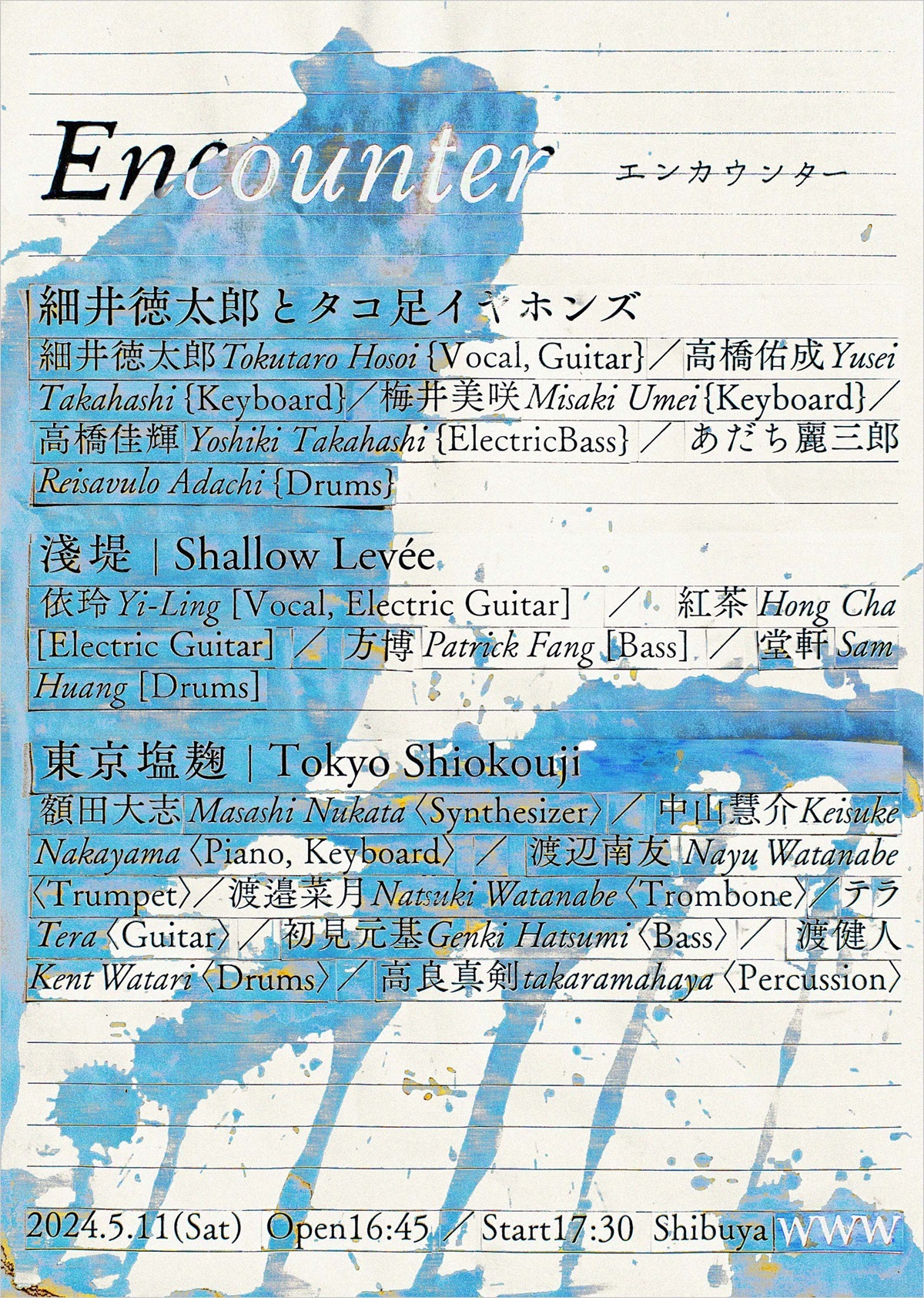 『Encounter』は、コンテンポラリーポップバンド・東京塩麹が主催する、アジアのインディーミュージックシーンで活躍するアーティストを招き、ジャンルやスタイルに捉われないバンドとの出会いを目的としたライブイベント。