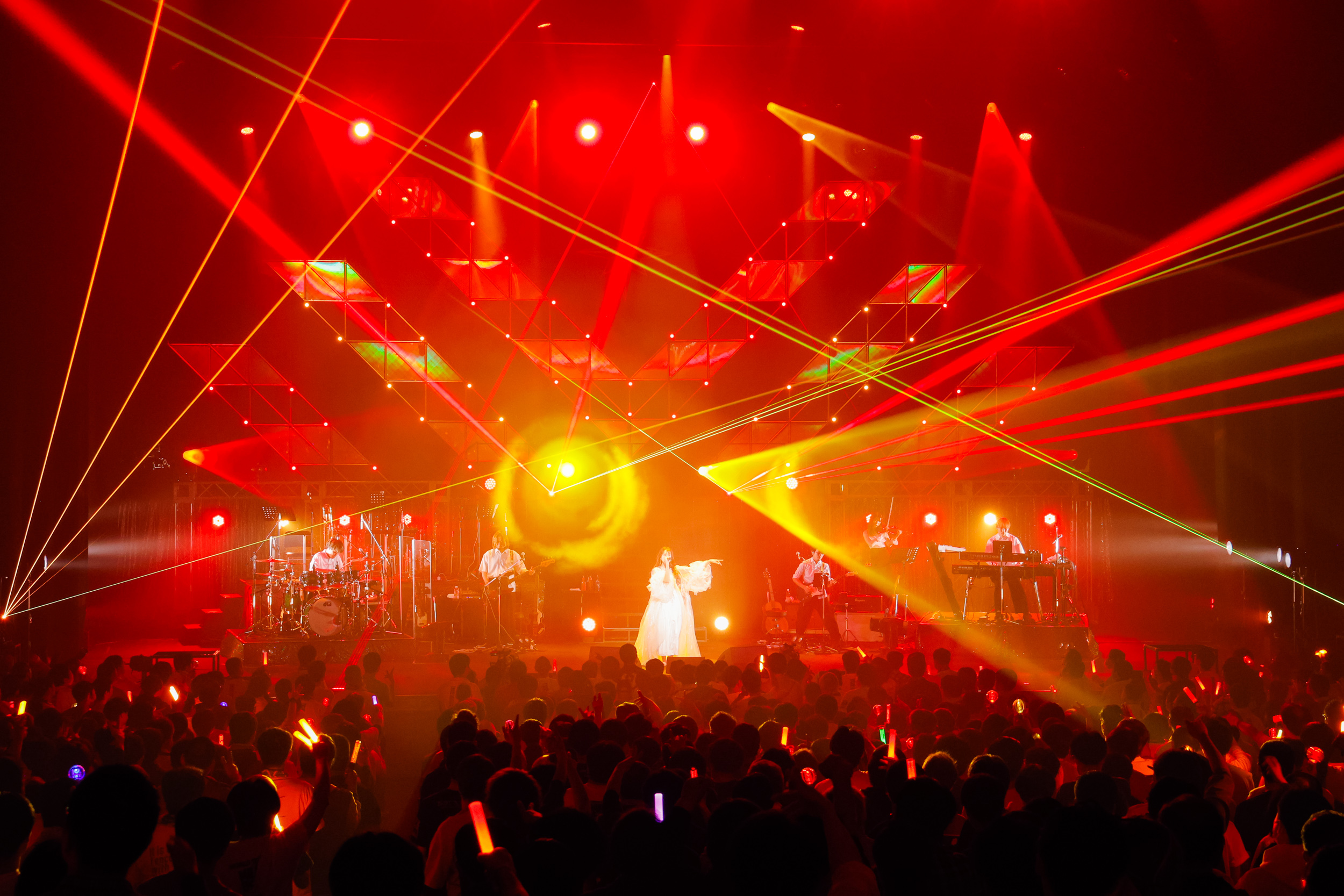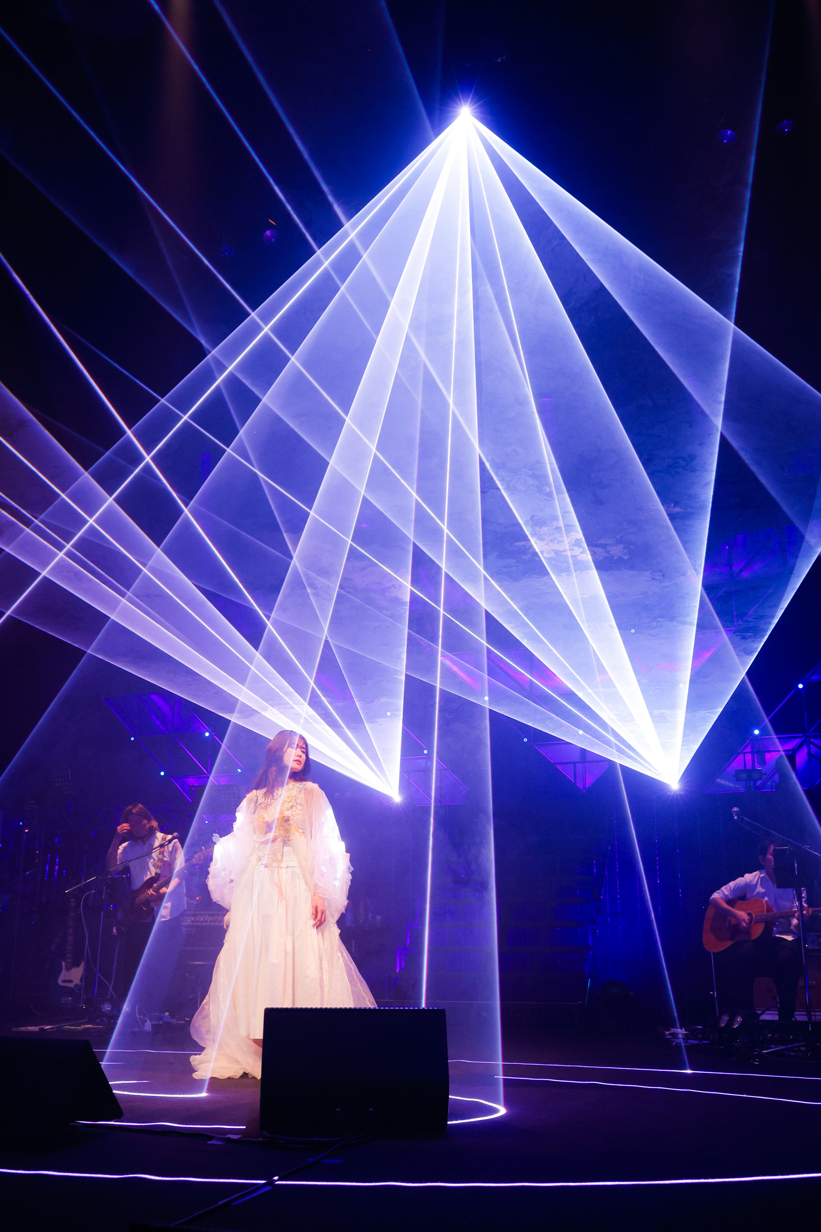 飾らない言葉から「alies」。サックスの音色もつややかに始まったTVアニメ『純潔のマリア』ED主題歌のこの曲が、開幕からの勢いで火照った身体に染み込んでくるようだ。2番からリズム帯も増えて盛り上がってくる中、脈動のように歌の温度が変わっていく。その流れのまま「Story of Lucifer」、そして「黎明」へと続ける。印象的にレーザーの演出がTRUEを包む、レーザーは全体通して世界観を表現するのに素晴らしい効果を発揮していた。その光も相まってTRUEはまるで祈りを捧げる巫女のように歌を紡ぎあげる。