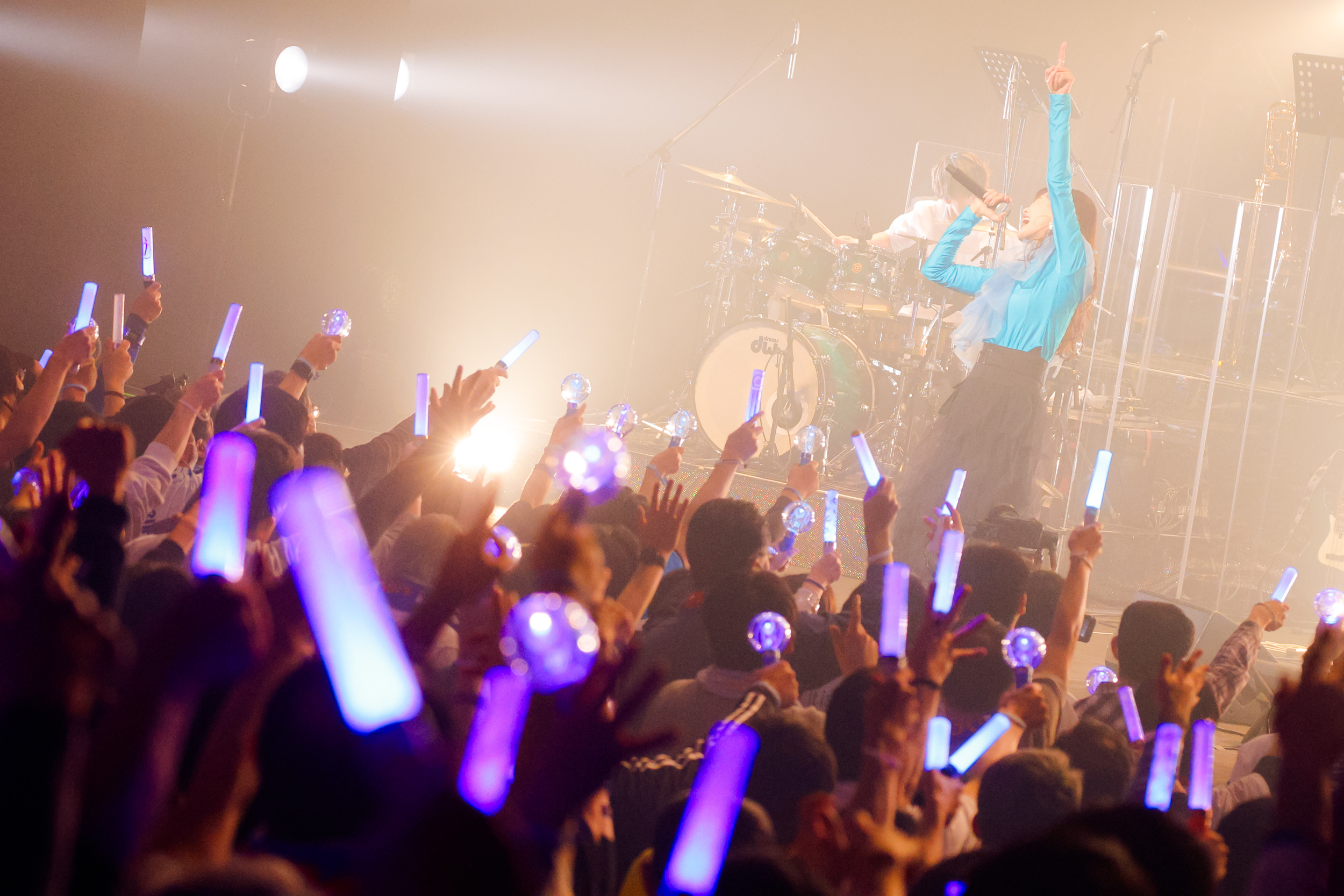 「あったかくて優しい時間になりますように」その言葉から奏でられるメロディー。TVアニメ『終末なにしてますか?忙しいですか?救ってもらっていいですか?』EDテーマ「フロム」だ。優しい声。今日はどこか全体的に可愛らしさを感じるのは、このライブの空気がそう思わせてくれるからなのだろうか。そこからの「アンサンブル」。聞き入る観客からのシンガロングは感動的でもあった。