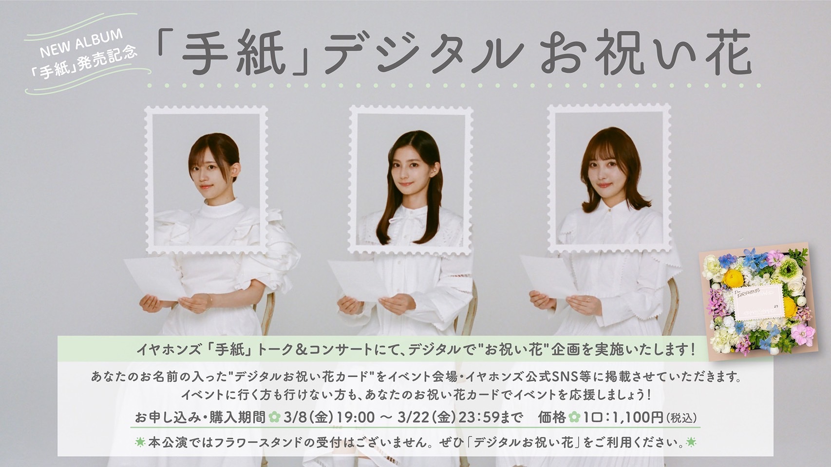 さらに、イヤホンズ「手紙」デジタル祝い花企画も発表となった。本企画は、自身の差出人名の入ったデジタルお祝い花カードを一口1,100円(税込)から購入することができ、参加特典として『イヤホンズ「手紙」トーク&コンサート』会場やイヤホンズ公式SNS等にそのカードが掲載されるという新しい企画だ。イベントに参加できない人でも、お祝い花カードでイベントを応援することができるのでぜひ参加してみたい。※企画参加のURLは欄外に掲載。