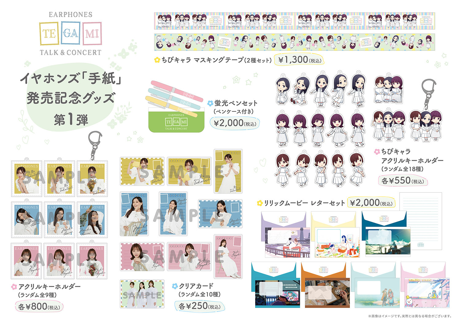 合わせて、イヤホンズ『手紙』発売記念グッズ第1弾のラインナップも発表となった。アルバムのビジュアルをSDキャラクター化した“ちびきゃら”柄のマスキングテープとアクリルキーホルダー、全曲に制作されたリリックビデオの場面絵をモチーフにしたレターセット、メンバーカラーのマットで大人なデザインの蛍光ペンセットにはビニルケースがつく豪華仕様。その他にも、切手やはがきのデザインに縁どられたアクリルキーホルダー、はがきや便箋のようなデザインのクリアカードなど、アルバム“手紙”のコンセプトに沿ったグッズラインナップとなっている。