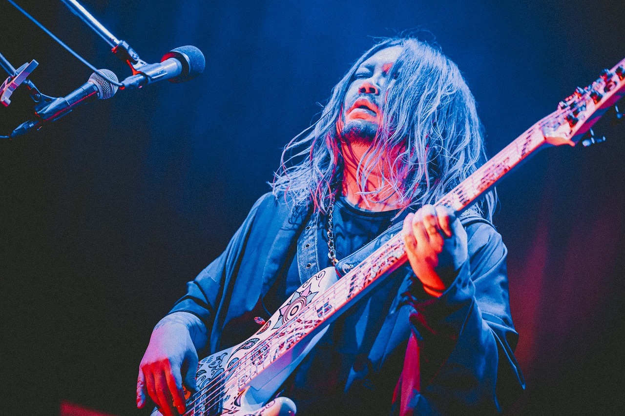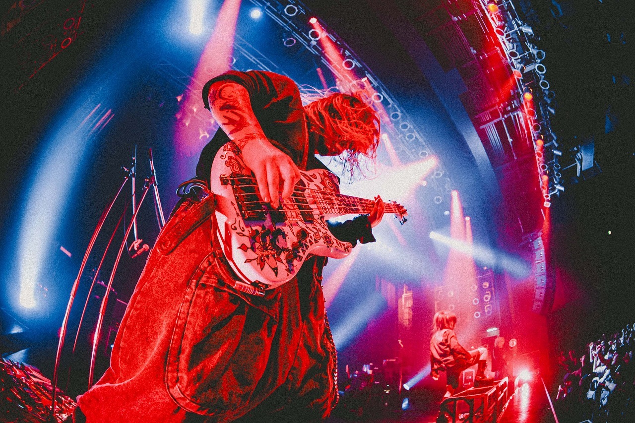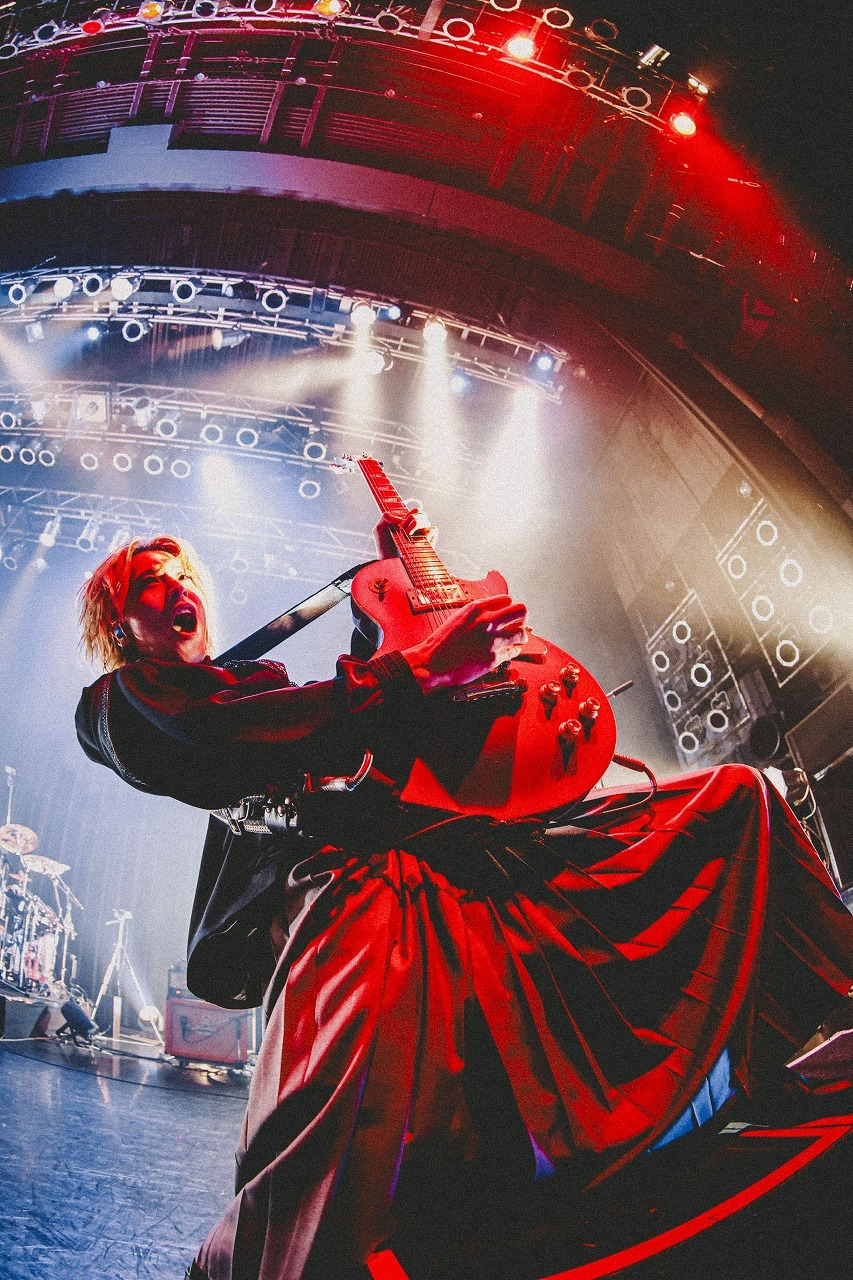 ステージが真っ赤に照らし出されると、ドクドクと脈打つようなイントロから「君の脊髄が踊る頃に」へ突入。激しいサウンドと解放感のあるメロディでフロアの熱量はどんどん上がっていく。滑り出しから十分な盛り上がりに見えたが、曲の最中にSORAが「もっと!」と言わんばかりに自分の胸を拳で殴って見せ、千秋も「そんなもんちゃうやろ! 近づいてこい!」と焚きつける。「包丁の正しい使い方〜実行編〜」の怪しいイントロが始まると、歓喜の声があちこちで上がり、さらにヒートアップ。ヘッドバンギングの嵐の中、青い光に照らされるメンバーの狂気が滲む表情にゾクゾクさせられる。