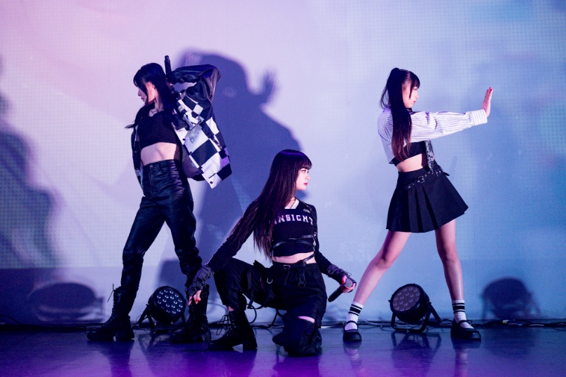 そして、中村の「いただきバベル」(アザブエリア)では、歌詞にある「アタシみたく楽しくなりたきゃ 飛び跳ねろ」で会場のボルテージが一段階上がる。ダンスカバーブロックの最後は、3人で「Crush」(カブキエリア)、「NEW FRONTIER」(アキバエリア)をパフォーマンス。Bellemuleのストロングポイントであるダンススキルの高さを観客に示した。