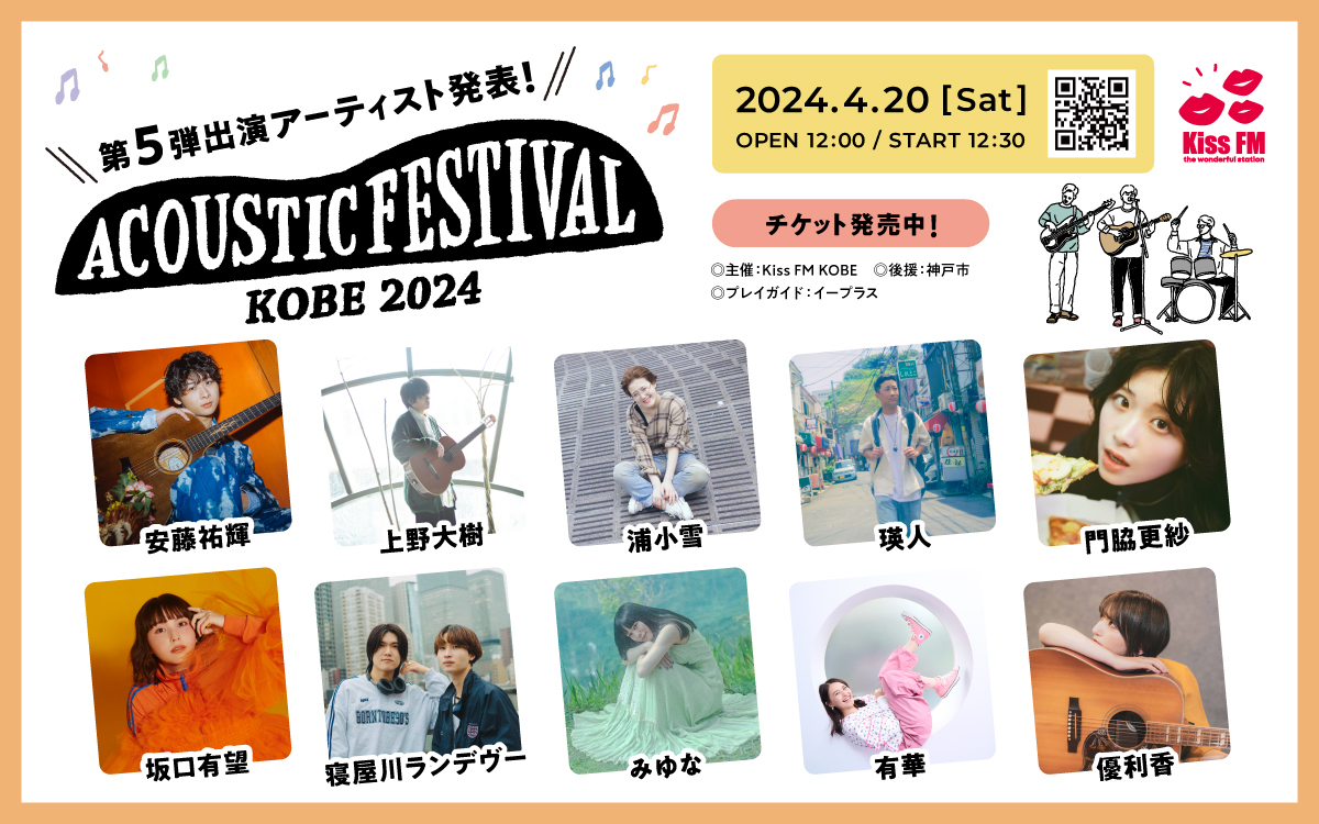 4月20日(土)に神戸の三宮・元町エリアで開催される、Kiss FM主催イベント『アコースティックフェスティバル』の第5弾アーティストが発表された。