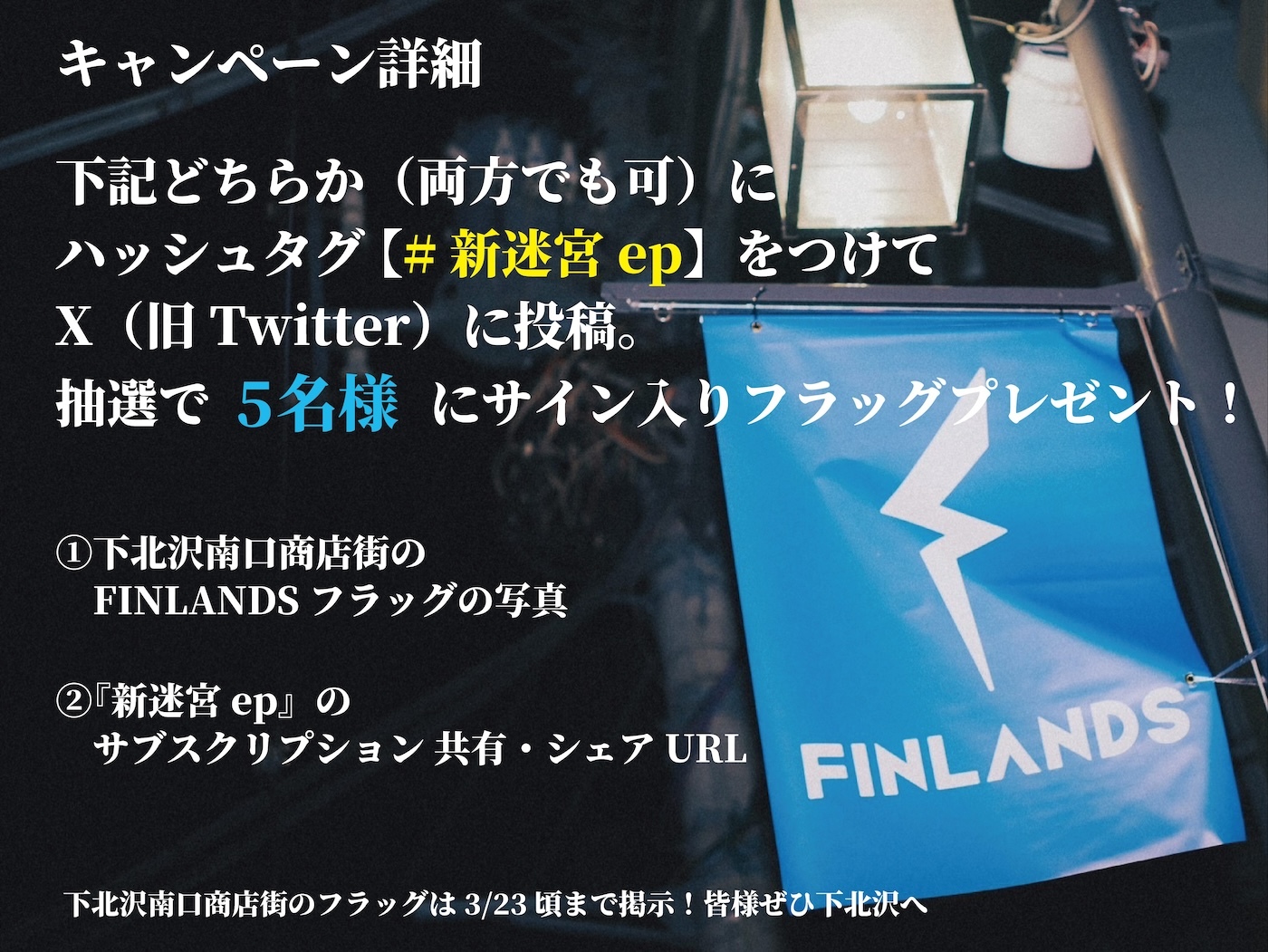 また、EPリリースを記念して、プレゼントキャンペーンも開始された。キャンペーンに参加すると抽選で、現在下北沢南口商店街に掲示されているFINLANDSフラッグに直筆サインを入れてプレゼントされる。