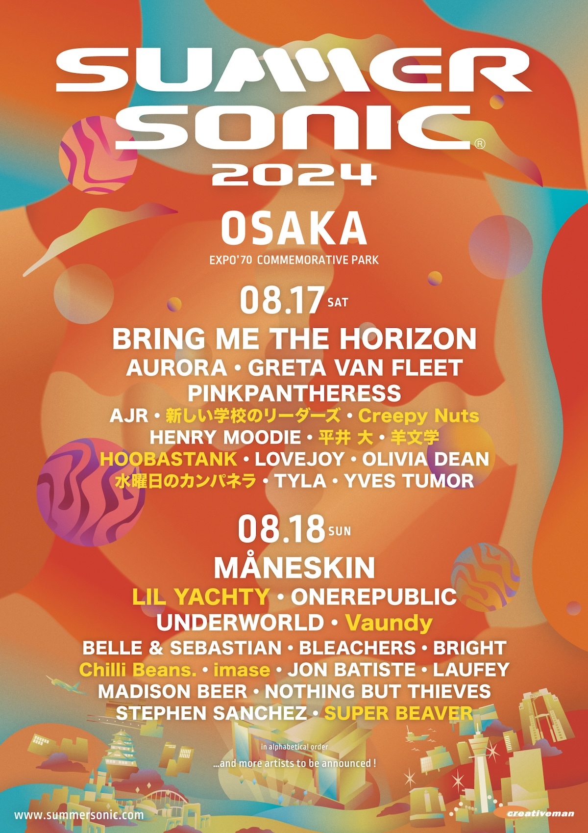 マネスキンがヘッドライナーを飾る東京8月17日(土)・大阪18日(日)には、ヒップホップの枠を超えてロック/オルタナサウンドにも意欲的にアプローチし、幅広く評価されるラッパーのリル・ヨッティ、 昨年のサマソニではビーチステージのキュレーターとして海外アーティストを中心とした仲間達との特別なステージを大成功に収めるなど、幅広い活躍も魅力の星野源がサマソニ東京に、非凡な楽曲センスから導かれる数ある代表曲は軒並みスマッシュヒット、令和の音楽シーンを牽引する若手アーティストの一人であるVaundyがサマソニ大阪に出演決定となった。ライブから伝わってくる圧倒的な熱量が老若男女の心を掴んで離さない、今や国内を代表するロックバンドとなったSUPER BEAVER、デビュー10周年を迎え遂にサマソニで日本初上陸となる韓国で国⺠的人気を誇る兄妹デュオ・AKMU(東京のみ)に加え、2000年生まれのアーティストでありポップミュージックの新たな発信者として一躍グローバルな人気を手にしているimase、ポップかつ癖になるソングライティングが人気の女性3人組バンドで、今年初の日本武道館公演をSOLD OUTにするなど今後の活躍も見逃せないChilli Beans.など国内で台頭する次世代アーティストがサマソニに集結する。