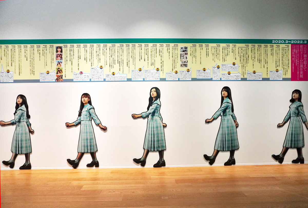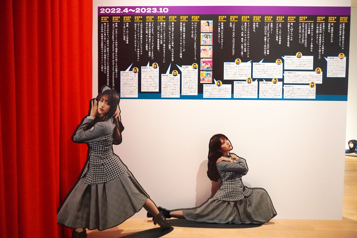 本展で印象に残るのは、会場のさまざまな場所にあるメンバーたちの等身大パネルだろう。特に第3章「上昇気流の少女たち」の演出はダイナミックで、ブースに足を踏み入れると、まるでライブの一幕のようなポーズを取る彼女たちに出迎えられる。