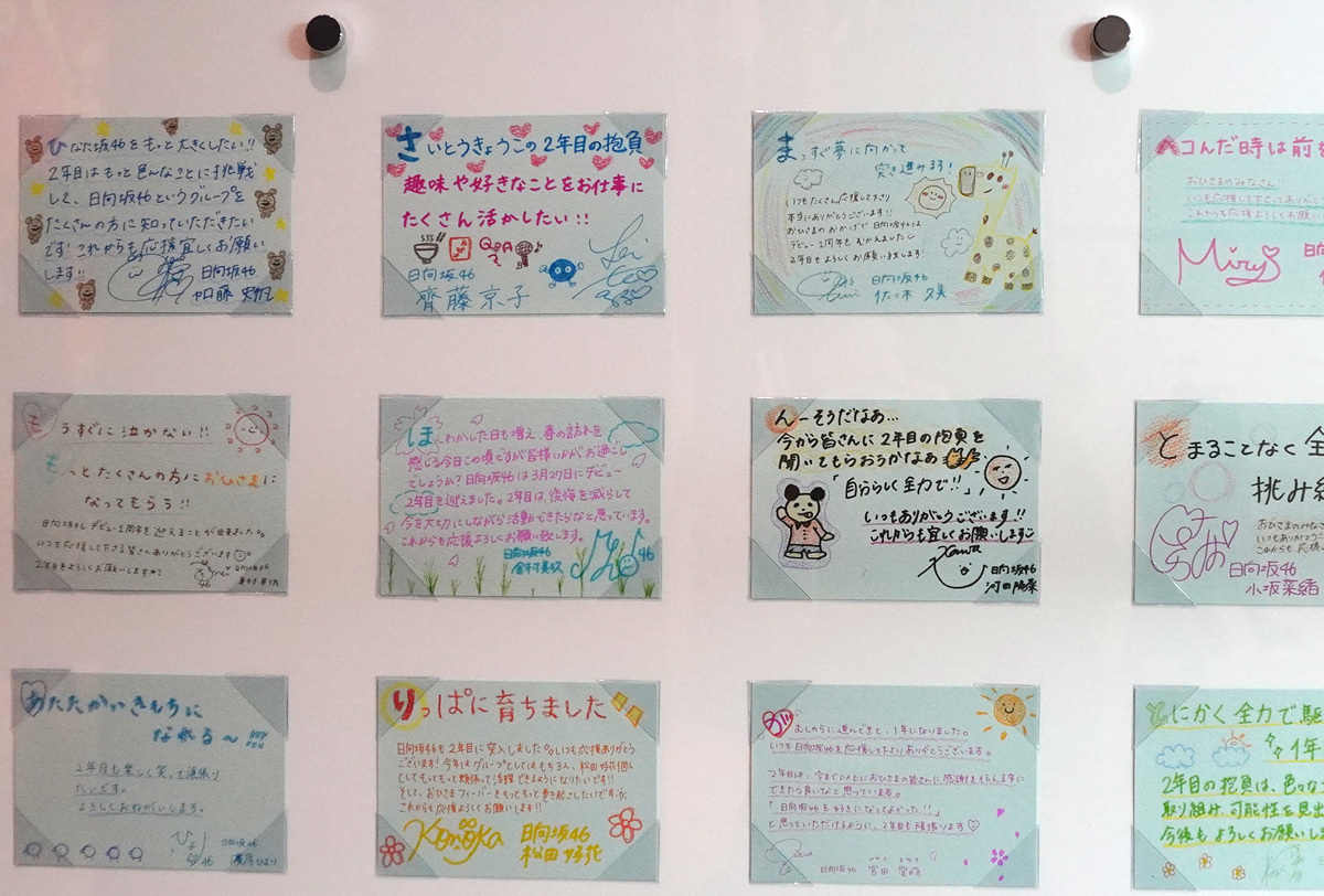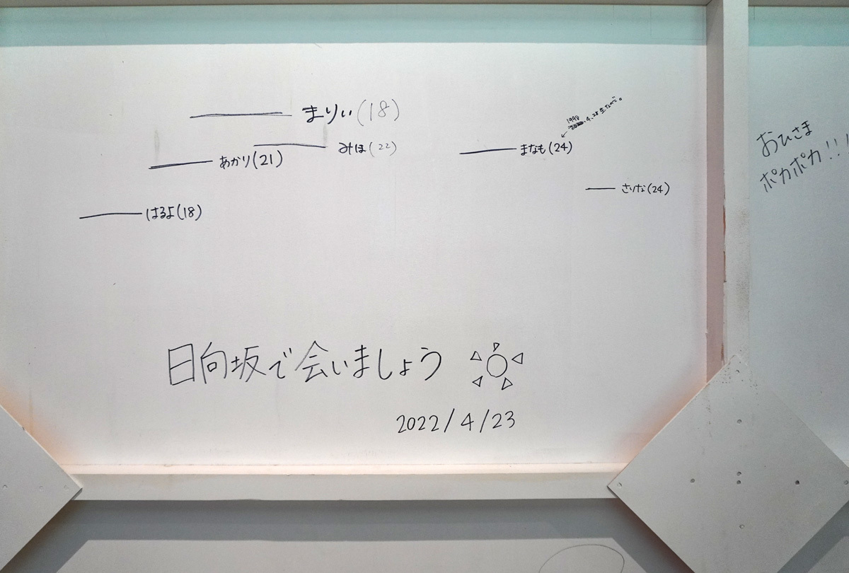 そのほかにも、「僕なんか」ヒット祈願で制作されたパネル、ファーストアルバム『ひなたざか』のリリース企画としてメンバーが心を込めて制作したてるてる坊主、「日向坂46 デビュー1周年記念 生配信!」におけるSNS告知のメッセージカードなど、彼女たちを身近に感じられる展示品も数多い。