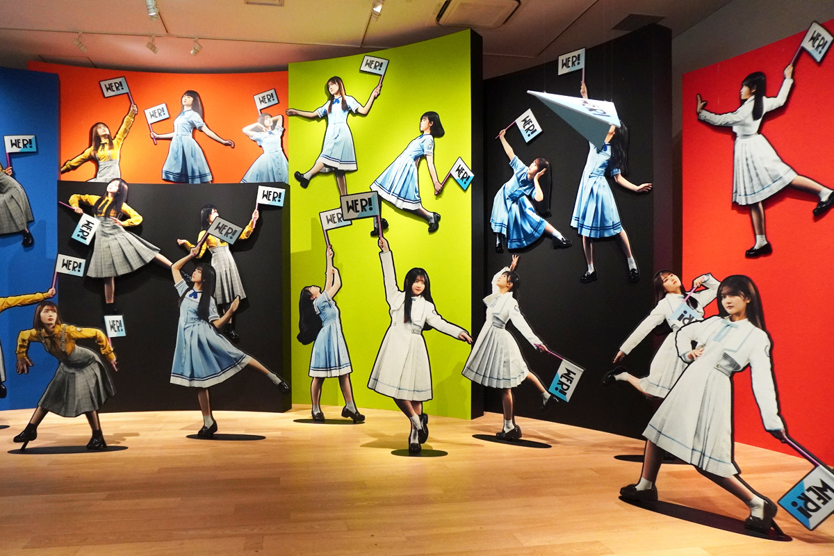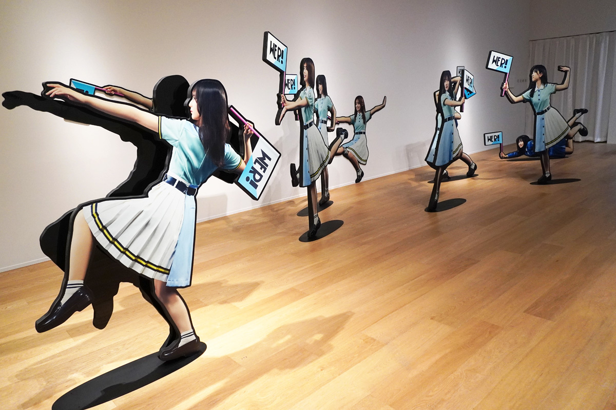 「WE R!」のフラッグを掲げる彼女たちの表情は、笑顔だったり真剣だったり、ときには変顔をつくっていたりもするが、いずれも前向きで清涼感がある。どんなに面白いポーズを取っていても、さすがはアイドル。所作の一つひとつがびしっと決まっている。それぞれのパネルがメンバーたちの個性や魅力を反映しているので、彼女たちが持っている魅力や物語を想像することができる。また、会場には約120体ものパネルが並んでいるので、「推しを探して見つけ出す」という楽しみも味わえる。