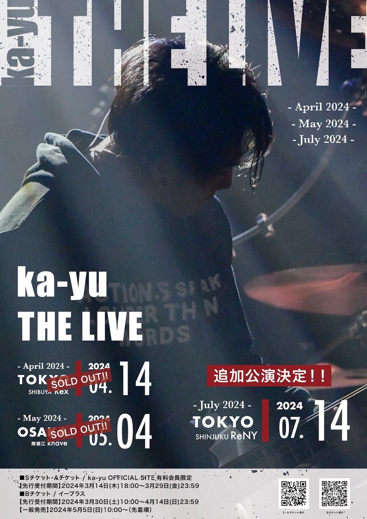 追加公演『ka-yu THE LIVE -July 2024-』は、7月14日(日)に新宿ReNYにて開催。チケットは3月14日(木)18:00より販売開始となった。