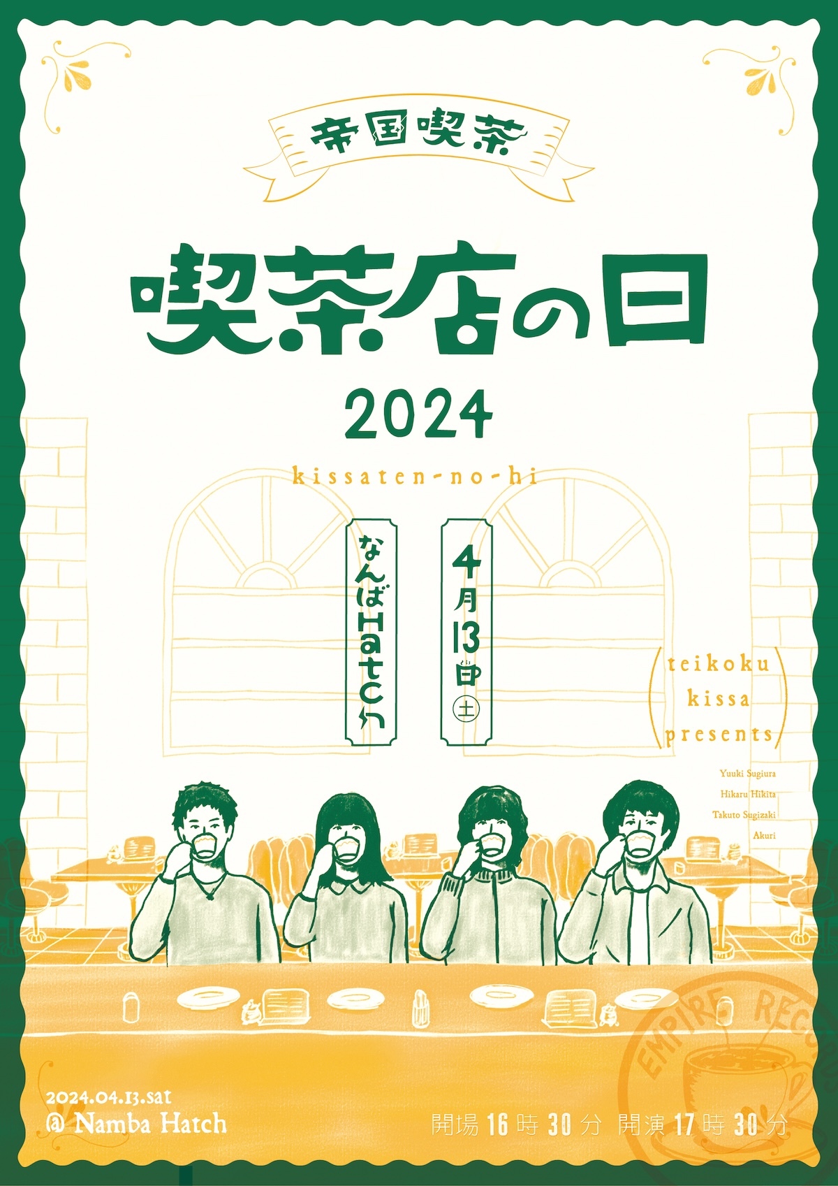 最新作『ハロー・グッドバイ – EP』を先日リリースし、全国13箇所を廻る『ワンマンツアー2024「きみの待つ場所へ春のメロディーを」』を開催中の帝国喫茶が、来月に控えている自主企画イベント『喫茶店の日 2024』のキービジュアルと詳細を発表した。