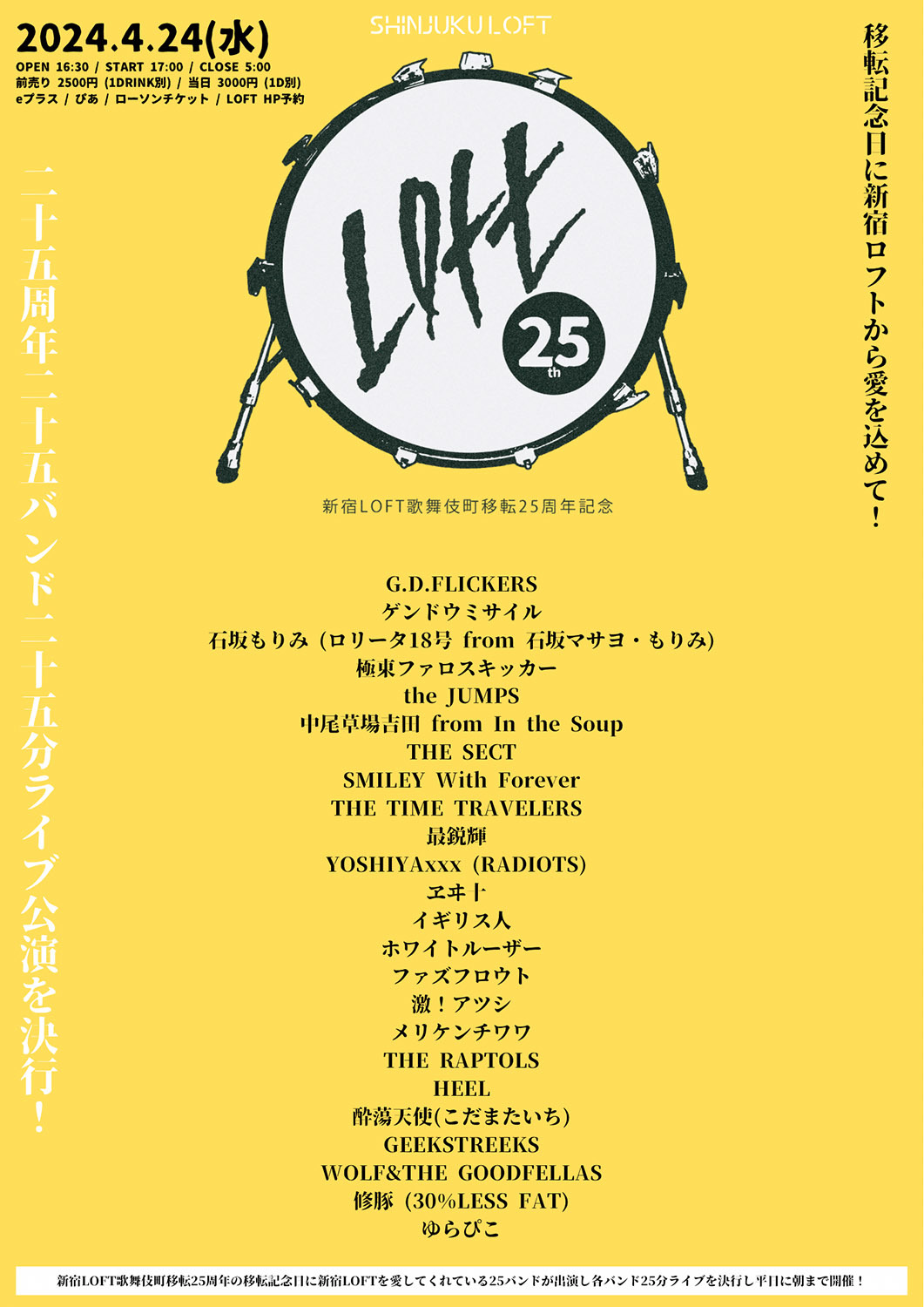 2024年4月から、新宿LOFTで開催される「新宿LOFT歌舞伎町移転25周年記念」として、移転記念日である4月24日 (水)に新宿LOFTに長年縁のある25組の出演バンドによる各バンド25分ライブの開催が発表された。