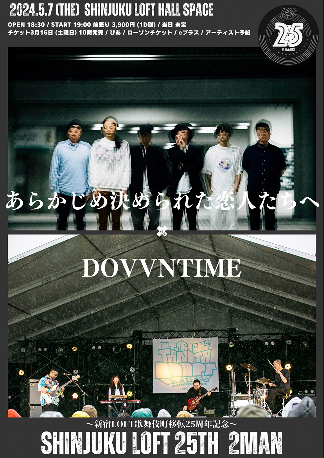 5月7日(火)にあらかじめ決められた恋人たちへ×DOVVNTIMEの2マンライブが開催。チケットは3月16日 (土) 10:00から各プレイガイドにて販売がスタート。